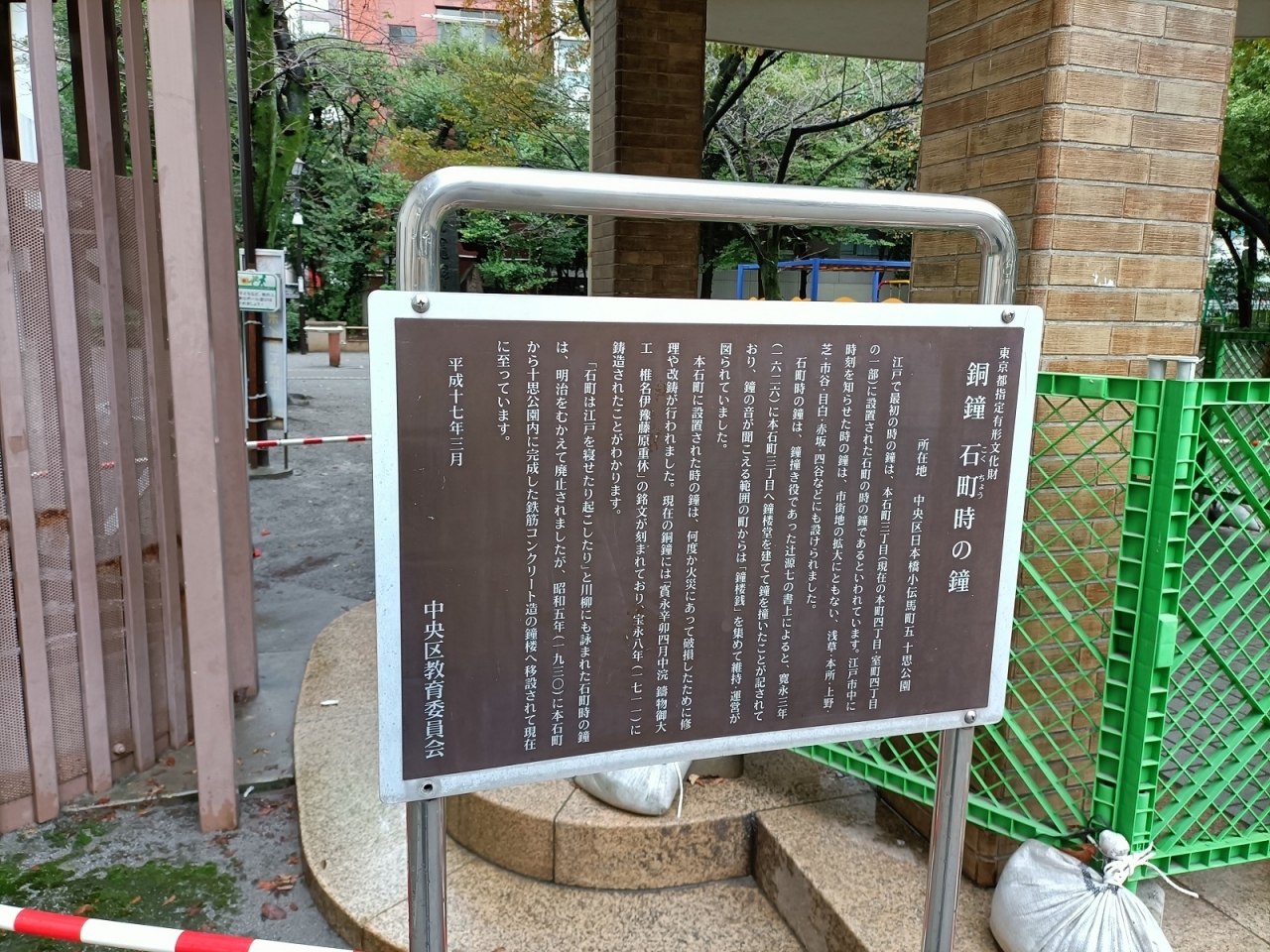 石町時の鐘や吉田松陰終焉の地を示す石碑、杵屋勝三郎記念碑などが設置されていました。
