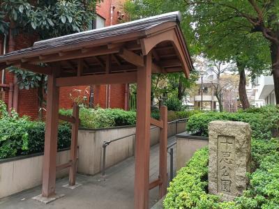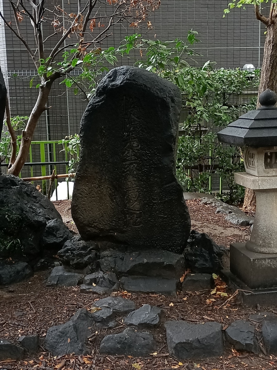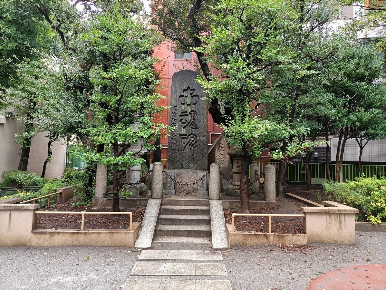 東京メトロ「小伝馬町駅」からほど近い場所にある【十思公園】の一隅に、一隅にある三基の黒っぽい石碑があり、それが【吉田松陰終焉之地】を示す石碑でした。三基ある右側に「松陰先生終焉の地」と刻まれていると分かりましたが、他は漢字が読み取りにくかったです。