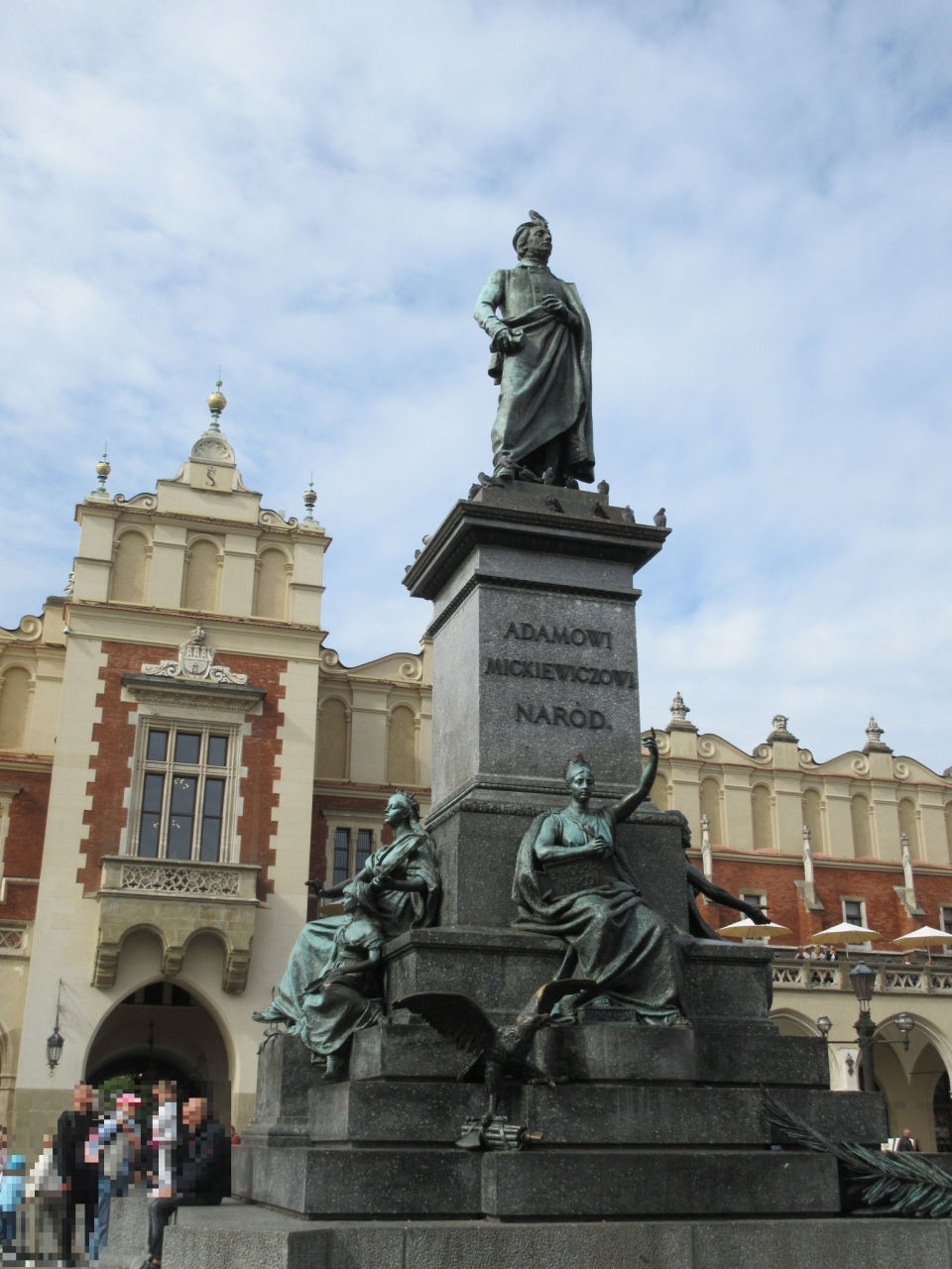 クラクフの【中央広場】に立つ存在感のある像がこちらの【アダム ミツキエビッチ像】です。クラクフ滞在中に4回程中央広場に立ち寄りましたが、朝を除いて像の周辺は大勢の観光客で大変に賑やかでした。正面から像を見るとバックに織物会館の趣ある建物が入り、記念撮影の絶好のスポットになっていました。
