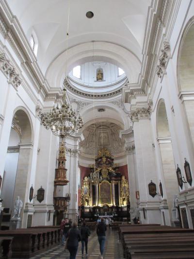 クラクフに滞在した際、【中央広場】からヴァヴェル城に向かうメイン通りであるグロツカ通りを歩いた際、左手に立派な聖人の彫刻が並ぶ教会があり、それがこの【聖ペテロ聖パウロ教会】でした。これぞバロック様式といったデコラティブなファサードが特徴的でした。内部に足を踏み入れると、祭壇を除いては白を基調としたシンプルな内装となっていました。