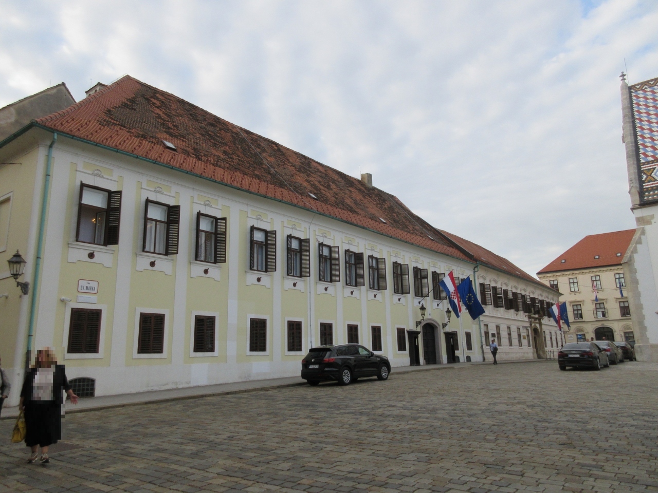 ザグレブ観光の際、ゴルニィ グラード地区と呼ばれる小高い丘を上がった所にある【聖マルコ教会】を訪問。その向かって右手には国家議事堂があるのですが、それと対になるように左手に見える黄色の壁面の建築が、首相官邸である【バンスキドゥヴォリ (バンズパレス)】でした。何の変哲も無い普通の建物に見えましたが、入口にEUの旗とクロアチア国旗が掲げられていたのが印象的でした。警備の方も殆どおらず、VIPの安全確保は大丈夫なのかと、こちらが心配になった位におおらかな警備体制でした。