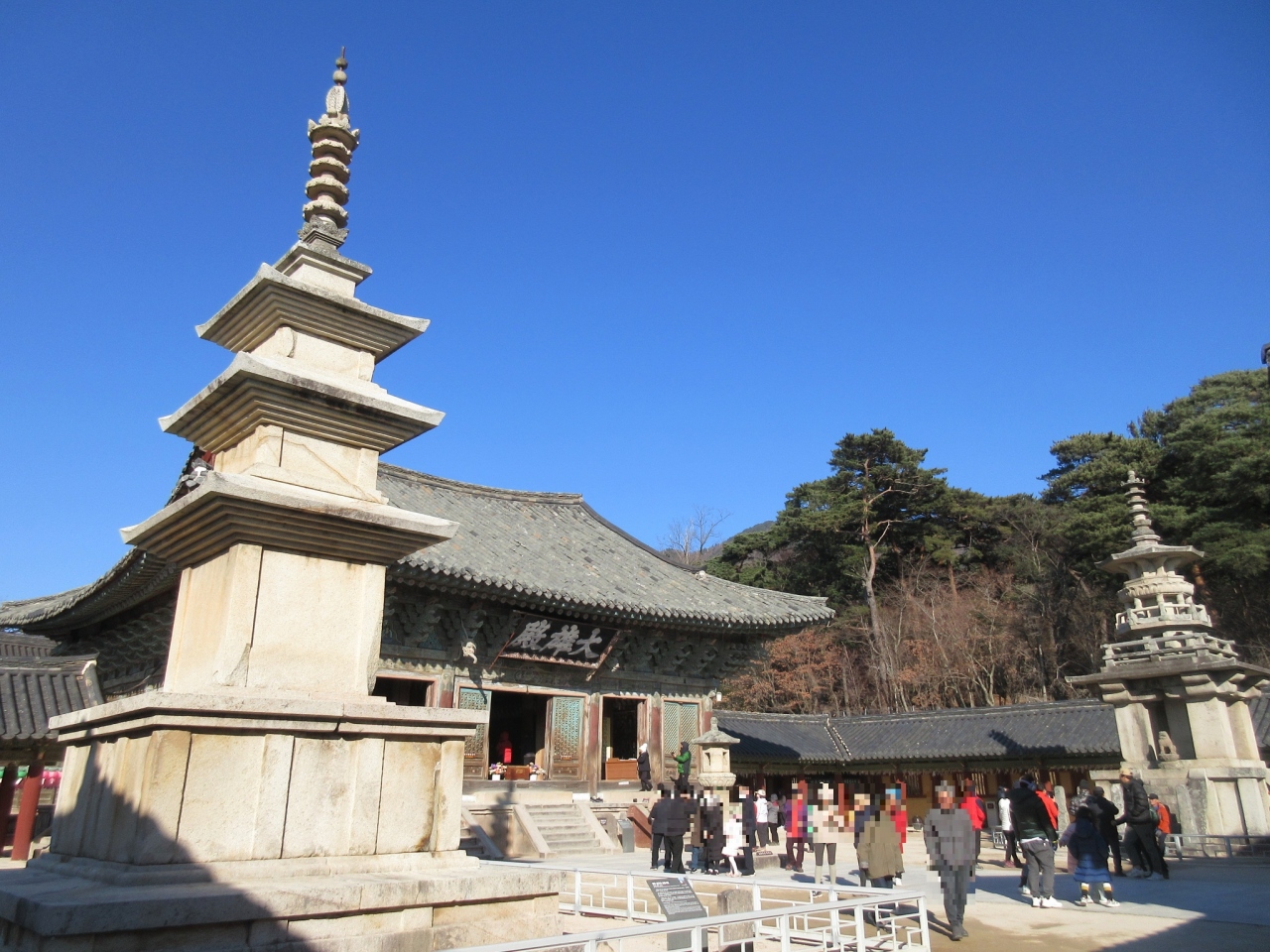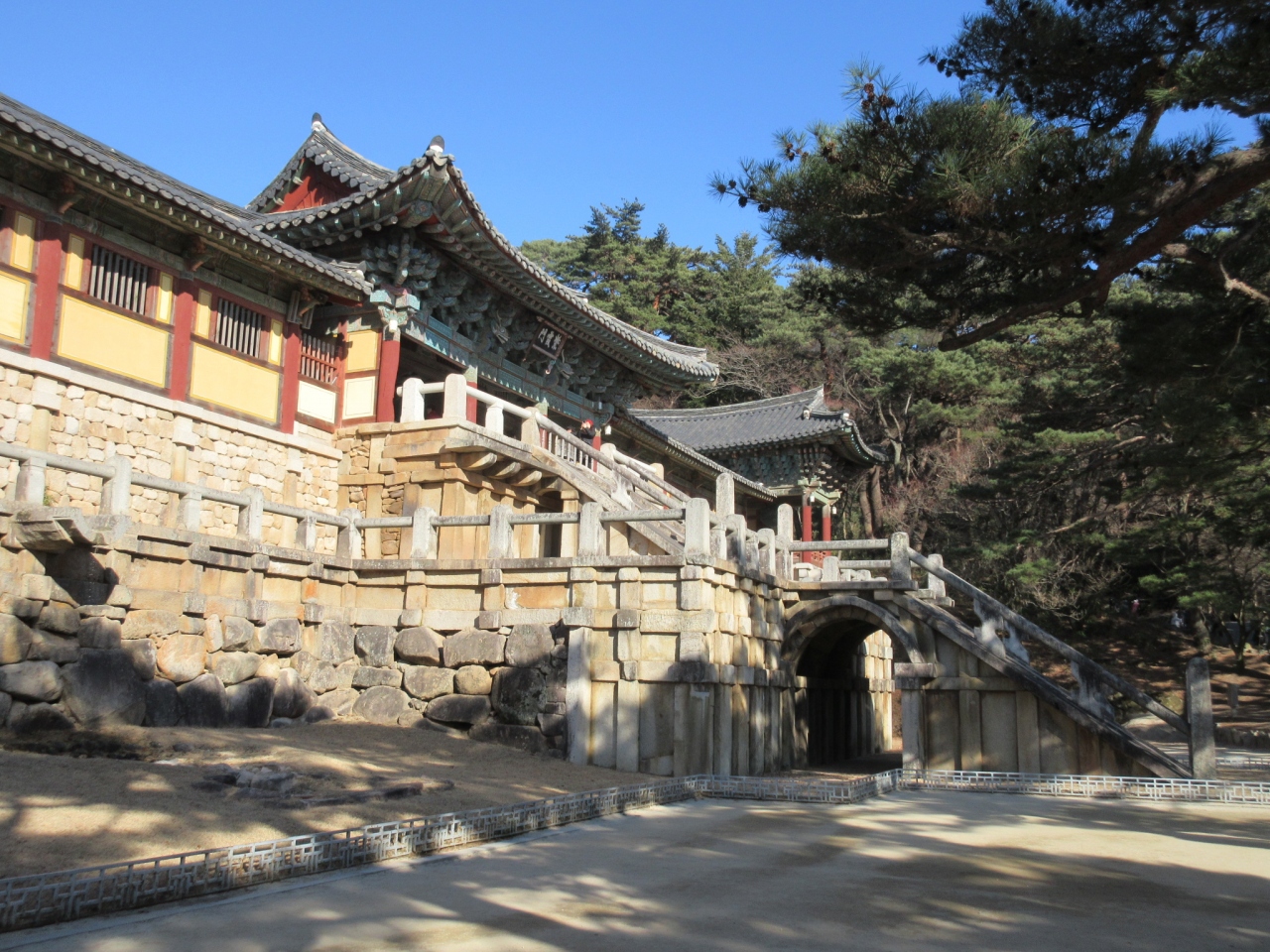 1月の寒い季節に、釜山からの日帰りで慶州を訪問しました。仏国寺は慶州の市内から少し離れるのでバスでのアクセスとなりました。青雲橋、白雲橋、蓮華橋、七宝橋という名前のついた石橋とその奥の安養門、紫霞門は旅行ガイドブックにいは必ず載っている見ごたえあるアングルで、大勢の観光客が記念撮影をしていました。その門の奥にある大雄殿とその手前の2基の石塔も、朝鮮王朝の技術水準の高さを今に伝える立派で見ごたえのある建物でした。慶州で必見のスポットです。