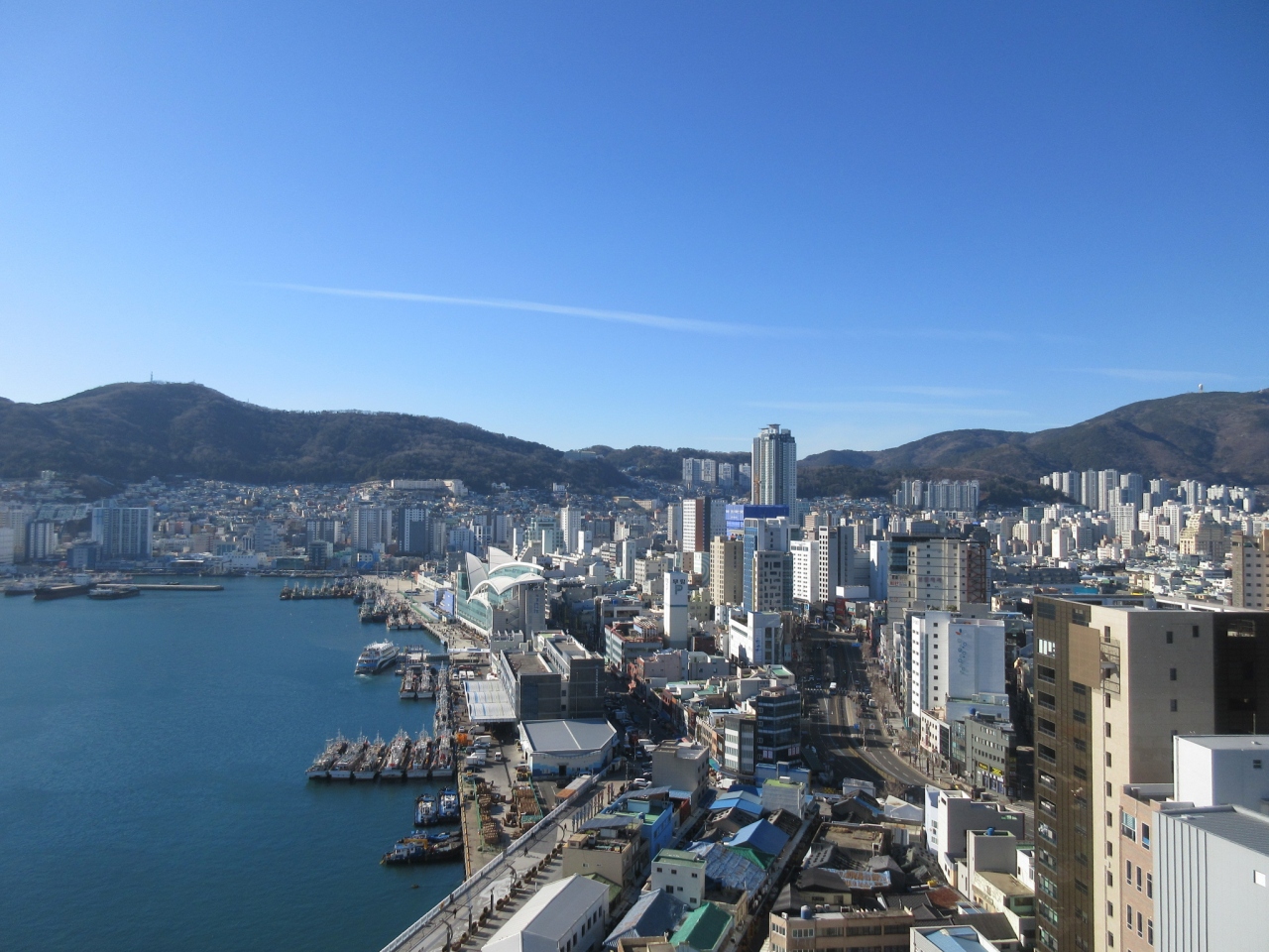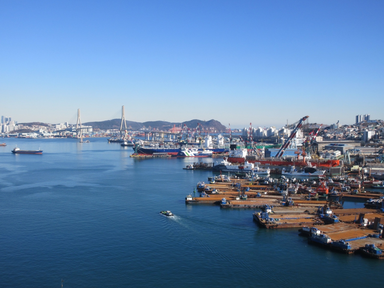 ガラスの汚れなど気にすることなく、影島や釜山港を手を伸ばせば届きそうな程に間近に眺めるが出来ました。