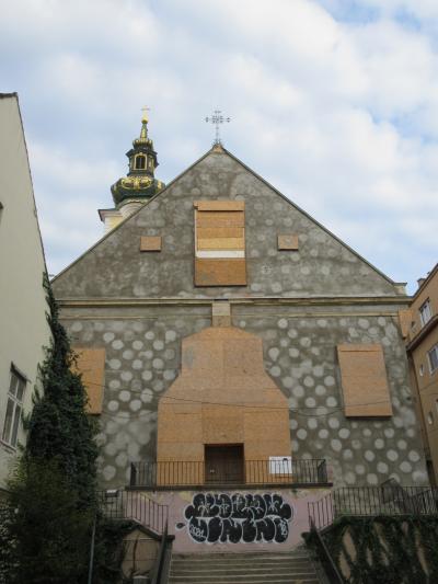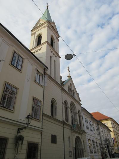 ザグレブ旧市街を散策した際、【聖マリア教会】のある丘の上から石の門をくぐって一段下の【ドラーツ広場】訪問に向かう際に、こちらの教会の尖塔が見えて来ました。趣のある家並の続く通りから覗く尖塔がとても美しいので、期待に胸を膨らませて近づいてみると、残念ながら西側は大規模な修復工事中で合板であちらこちらが覆われ、壁面も無造作にモルタルで塗られていて無残な姿をさらしていました。数年前にこの地を襲った地震の影響なのかもしれませんが。。。ザグレブの街のあちらこちらでこうした修復工事がおこなわれており、往時の姿を取り戻すにはまだ何年もかかるように思えました。