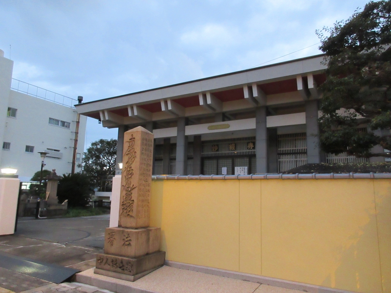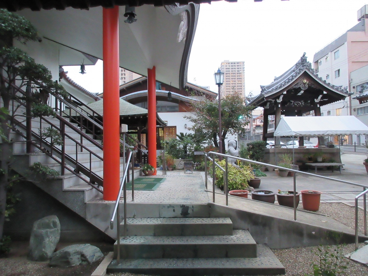谷町九丁目の駅で下車して寺町を散策しながら北上、【高津宮】から見て北東側の一角に、こちらの【法性寺】があり立ち寄りました。【ボードインゆかりの地】を示す石碑が山門の右手に置かれていました。境内に入ると、正面ではなくて左手に鉄筋コンクリートの本堂があり、階段を上がって参拝するようになっていました。