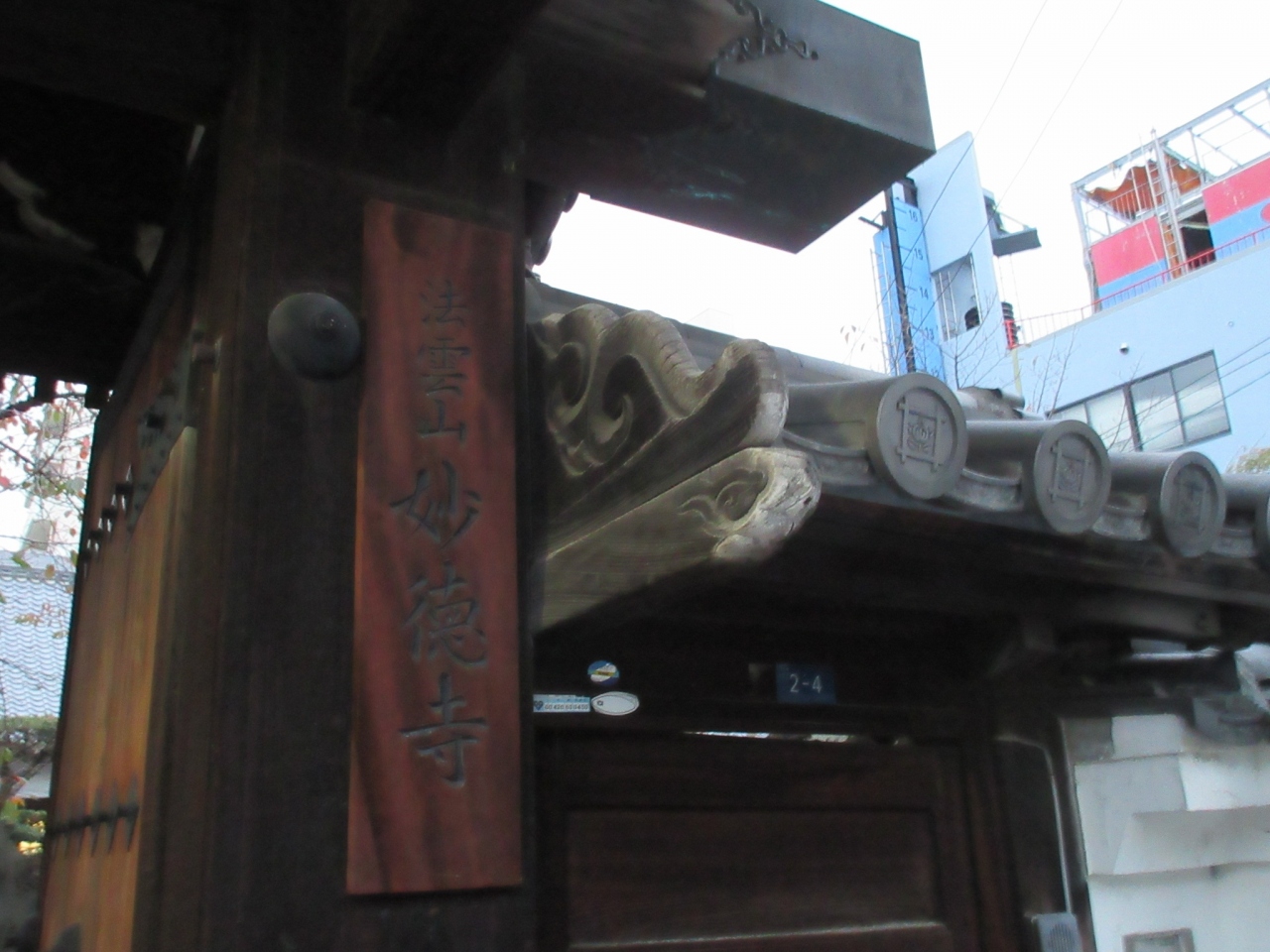 山門の右手に南無妙法蓮華経と書かれた立派な石柱があり、すぐにに日蓮宗系のお寺だと分かりました。
