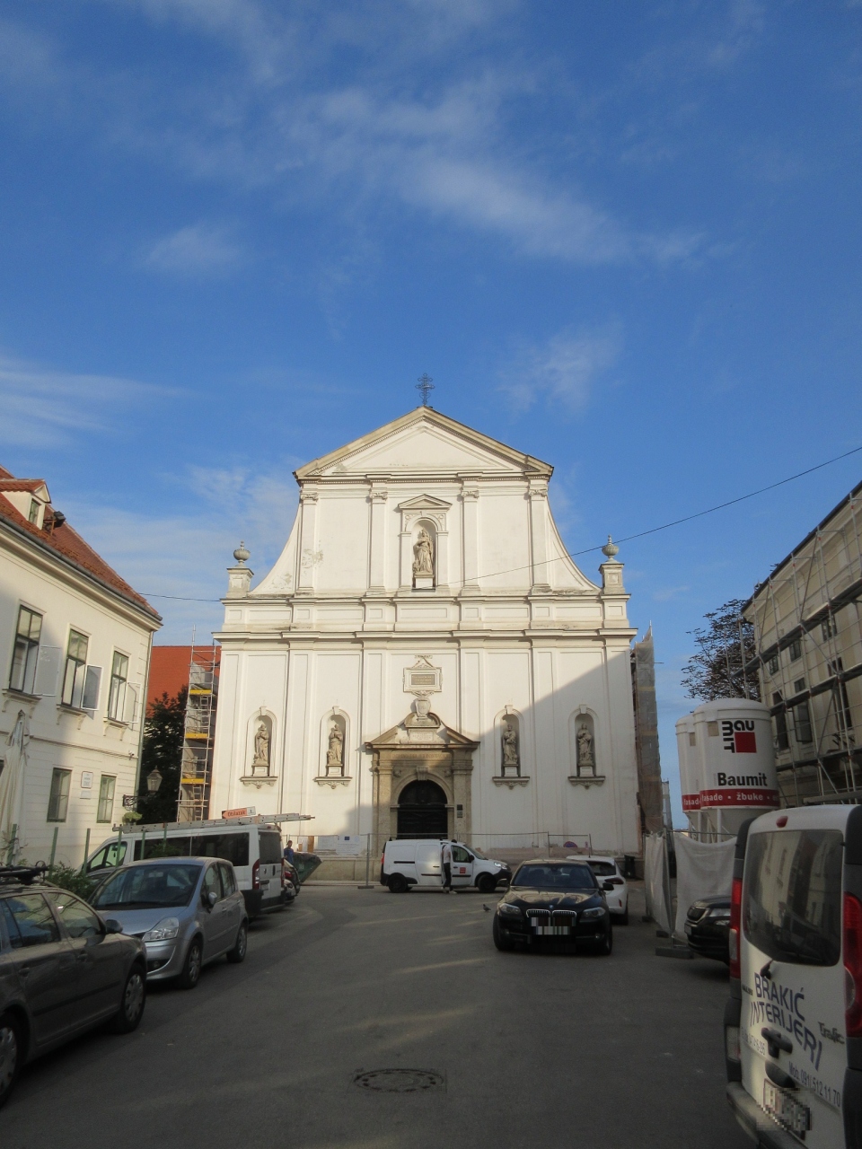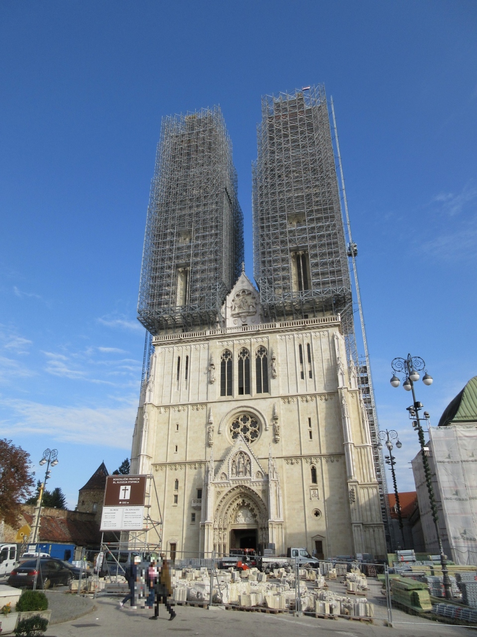 クロアチアの首都ザグレブ中心部、イェラチッチ広場から北東に5,6分の場所にある市内有数の大きな教会で、遠くからでも良く目立つ存在感のある建物でした。数年前の地震の影響らしく、地上には尖塔から外されたと思しき建材が並べられていて、内部はおろか近づくことさえも出来ず、柵の手前から外部を見学する事しかできませんでした。