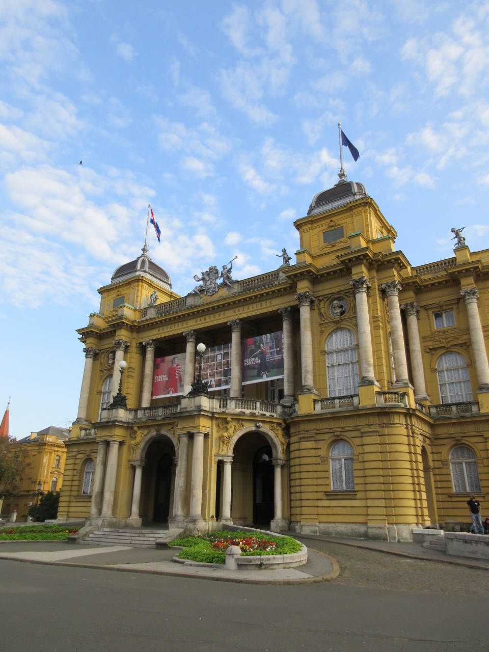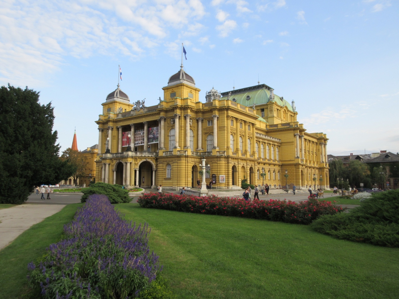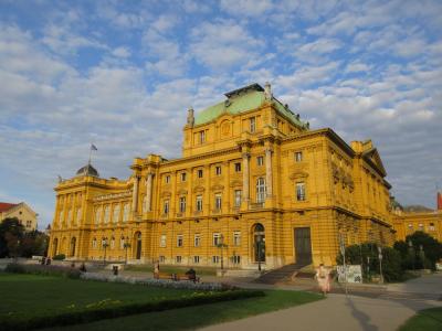ザグレブ観光の際、【イリツァ通り】通りから南側、ザグレブ駅からは北西にミラマ博物館をはじめとする文化施設があつまる一角を散策しました。その際、最も見ごたえがあると思ったのが、こちらのチトー広場に面した【クロアチア国立劇場】です。何本もの円柱が並んだ外壁は黄色く塗られ、更に正面ファサード上には音楽を奏でる聖人と天使の彫像が飾られていました。緑の芝生とその周りに植えられた色とりどりの花々も、それに合わせて自然のハーモニーを奏でているようでした。この劇場と周りを散策するザグレブの市民を含めて、その空気そのものが明るく開放的に感じられました。