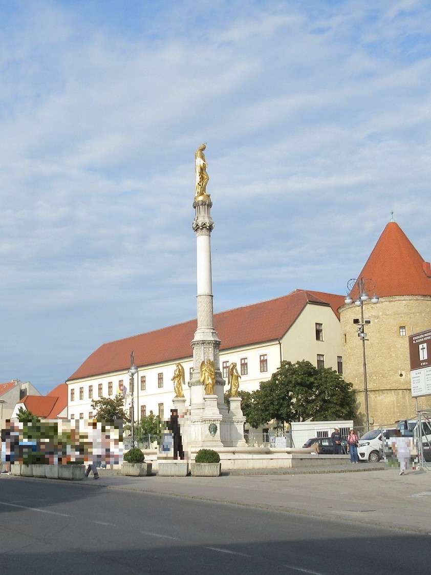 ザグレブの中心にある【ザグレブ大聖堂】を見学しようと緩やかな坂を上がっていくと、大聖堂前の広場のようになったところに、金色の聖母と思しき像を最上部に戴いた高いモニュメントが設置されていて、すぐに目に飛び込んできました。モニュメントの下部にも四隅に翼の生えた天使の金色の像が置かれ、非常に見ごたえがありました。また、この像の背後にはかつての城壁の名残と思しきずんぐりした中世の塔もあって、ザグレブの歴史を感じることが出来ました。