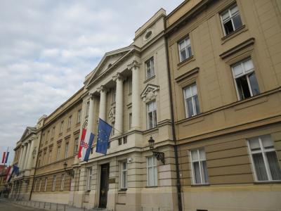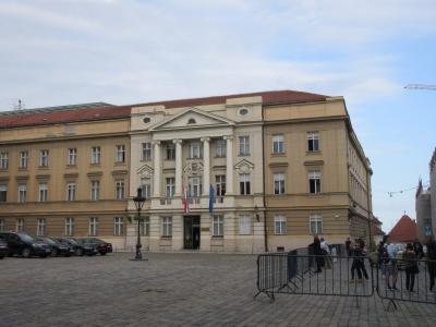 ザグレブの旧市街を散策して、ついに街のシンボルの一つ【聖マルコ教会】までやって来ました。その向かって右隣りに柵で囲まれていて、観光客の立ち入りが出来ない横に広い【国会議事堂】の建物がありました。二層から三層にかけてイオニア式の装飾のある円柱が印象的な、左右2か所のエントランスがあり、いずれもEUの旗とクロアチア国旗が掲げられていました。当然私のような観光客は入れませんが、要人らしい立派な身だしなみの方が柵の向こうを足早に歩いている姿も見えました。