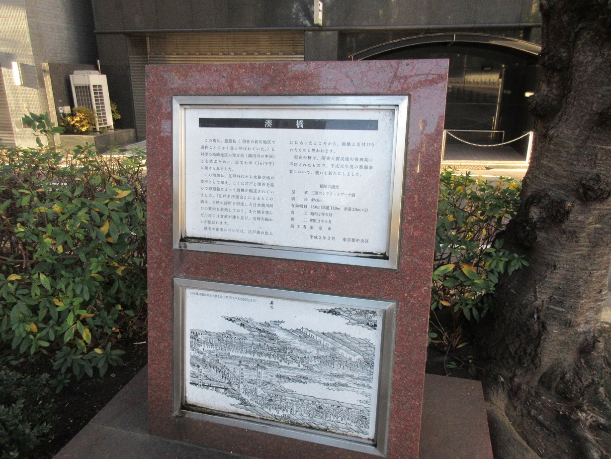 茅場町界隈を散策した際、箱崎のエアターミナル方面に向かう際、日本橋川にかかるこちらの【湊橋】をわたりました。三連のアーチが美しい橋で、昭和3年に竣工したという説明文がたもとに設置されていました。その説明プレートには、江戸時代の絵図も利用して橋の説明がなされており、視覚的にも分かりやすかったです。