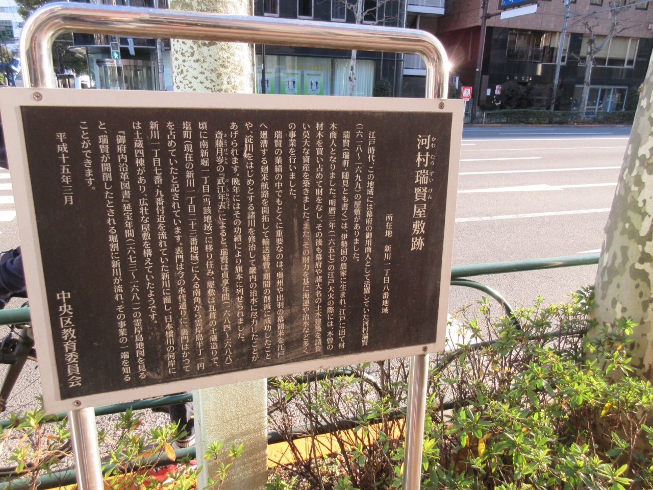 霊岸橋を渡って右手のホテルの手前の歩道に、江戸時代に活躍した商人【河村瑞賢】の屋敷跡を示す説明プレートが設置されていました。