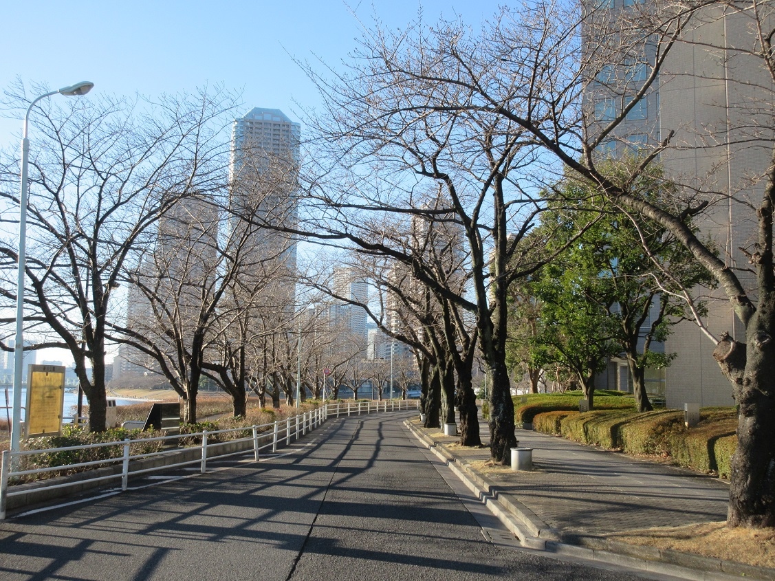 永代橋から南に向かってこちらの公園を散策しました。隅田川に沿って南北に広がる公園で、川下には【佃島】のタワーマンション群が、川上側に目をやると1926年に竣工した鉄骨造の【永代橋】と【スカイツリー】を眺めることが出来、東京の景観を楽しめるお勧めのスポットの一つです。私が訪問したのは1月でしたが、ジョギングや散策する方の姿もちらほら見られました。