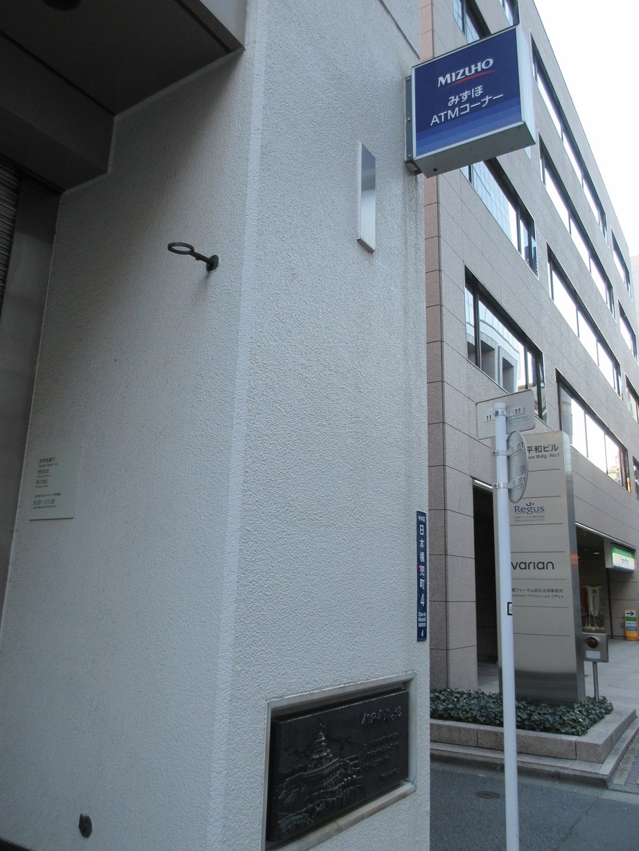 【東京証券取引所】界隈を散策していた際、みずほ銀行の店舗の1階、ATMのそばの壁面下の方に【銀行発祥の地】を示す金属のプレートが設置されていました。渋沢栄一が中心となって設立した「第一国立銀行」の、天守閣と洋館を折衷させたような特徴的な外観がレリーフとして現わされたプレートでした。歴史の授業で使った資料にこの銀行の絵が使われていたことを思い出し、歴史的な場所だと認識しました。