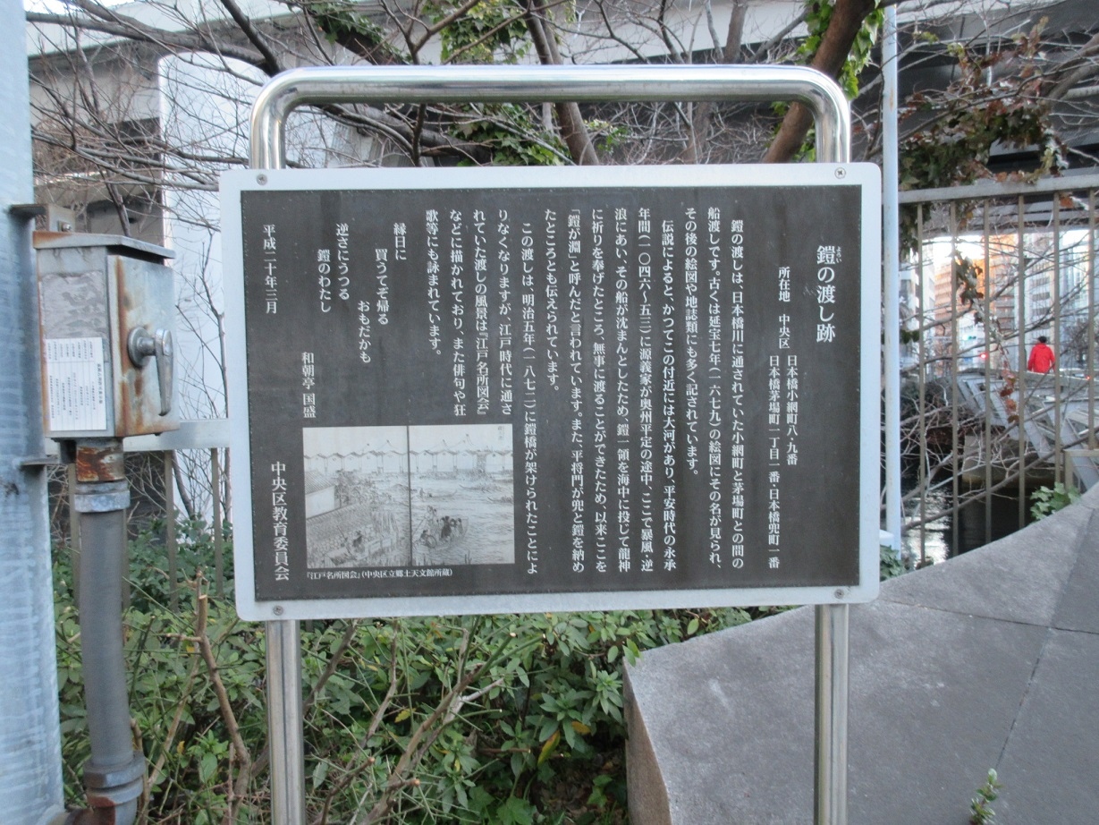 兜町界隈を散策した際、【東京証券取引所】からほど近い場所、日本橋川に面した場所に【鎧の渡し跡】の説明版が設置されていました。江戸時代にはこの場所にも渡し舟が運航されていたと知り少し驚きでした。他にも源義家にまつわる、ここから鎧を投げ入れたという伝説があることも詳しく説明されていました。絵も取り入れた説明プレートは非常に分かりやすく理解し易かったです。