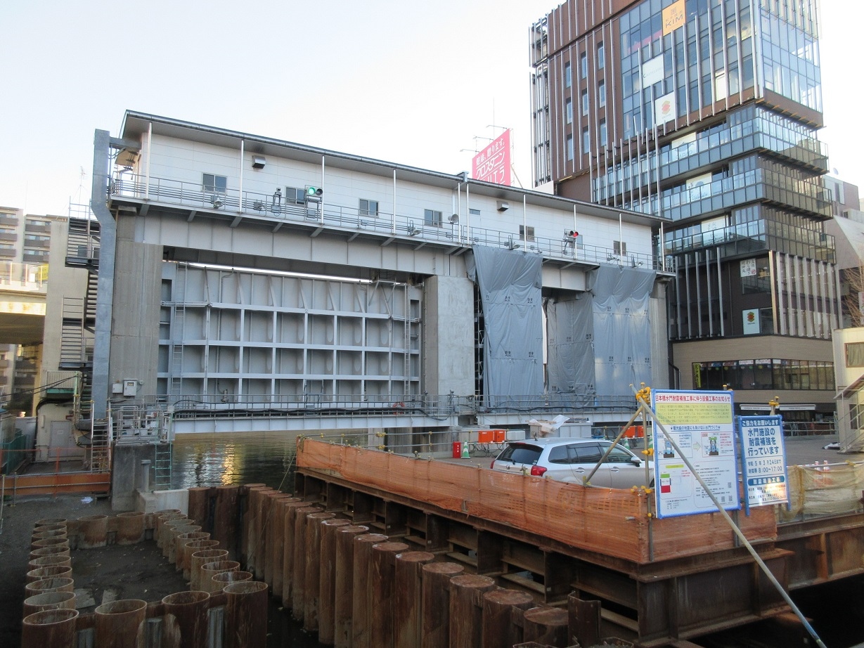 日本橋川と亀島橋が交わるところに造られている水門がこちらの【日本橋水門】で、霊岸橋あたりから見学しました。私が訪問した時は丁度「耐震補強工事」の真っただ中で、仮設の台座が設置されていました。水門の動く様子が見られると期待していましたが、工事中のため断念せざるを得ませんでした。