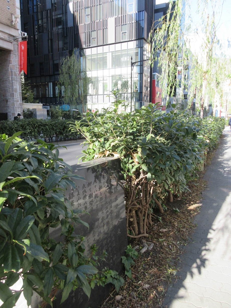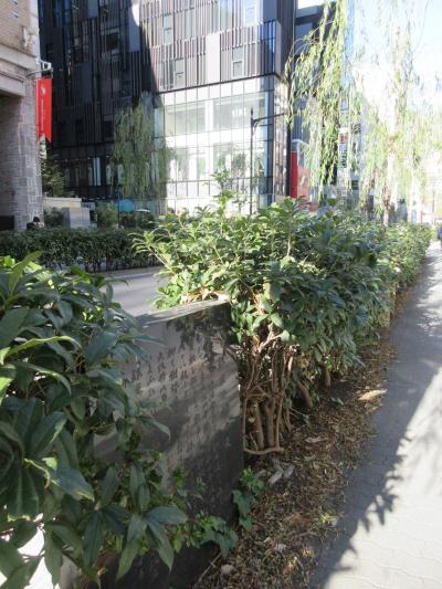 銀座界隈を散策し、銀座中央通りから銀座柳通りに入る交差点の近くの植え込みの中に、こちらの【銀座の柳由来の碑】がありました。背の低い御影石の石碑で、植え込みの中に埋もれるよになっていて、近くまで行って漸くそれと分かりました。石碑には、明治時代に柳の並木道が出来て、そのあと撤去されるなどの変遷を経て、現在に至ったことが記載されていました。「銀座の柳の下で会うは君一人~」古賀政男の「東京ラプソディー」のメロディーが思い浮かびました。