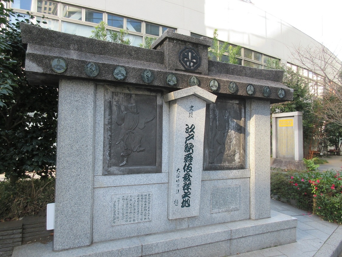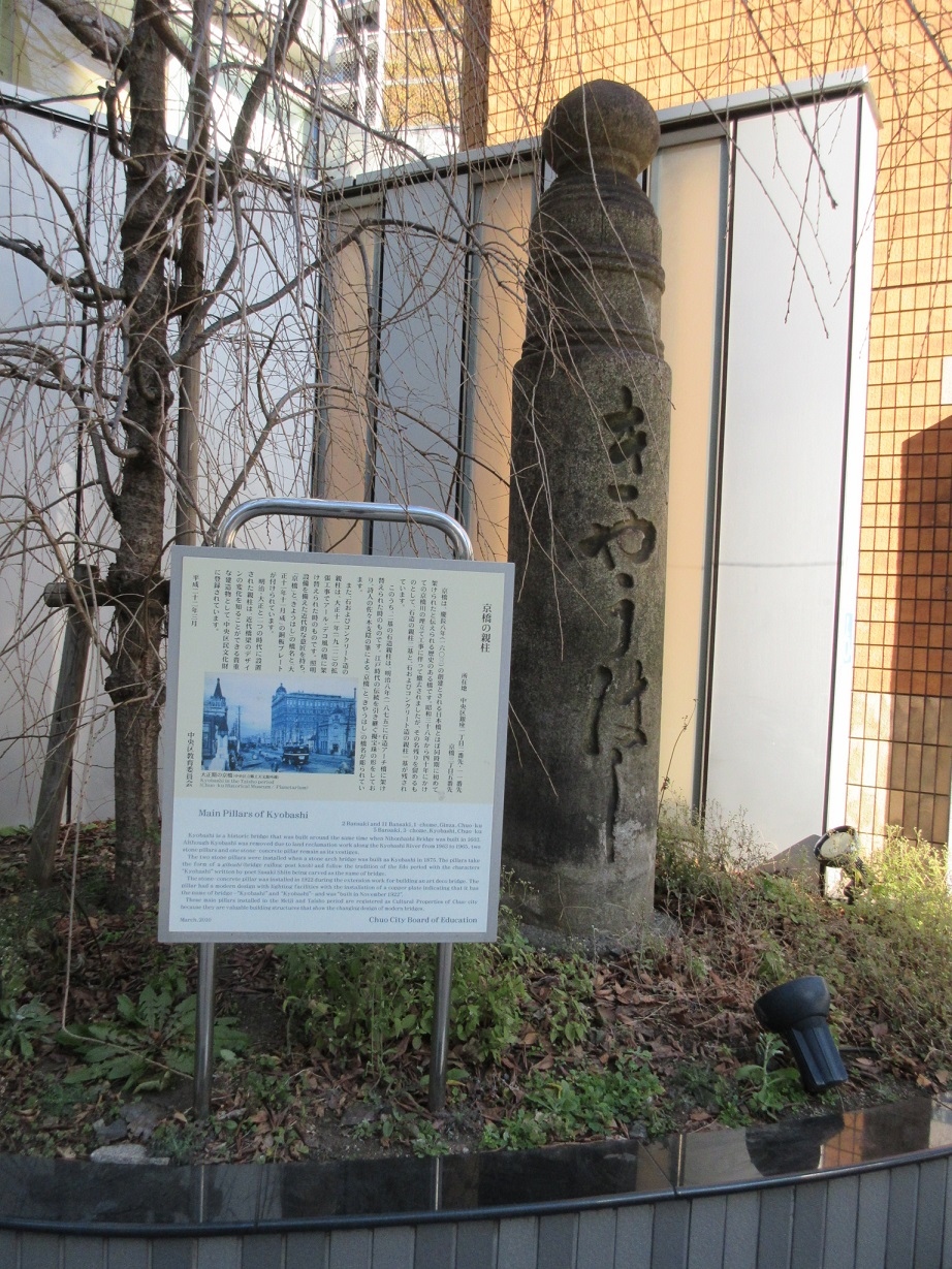銀座から銀座中央通りを歩き、京橋方面に向かって首都高をくぐった先の左手に、【京橋大根河岸青物市場跡】の石碑が立っていました京橋川という川が昔はこの場所に流れており、その河岸に青物を扱い市場があった事が記されていました。。今は近代的なビルが立ち並ぶこの場所で、大根や野菜を売る賑やかな声が響いていたとは、にわかには信じられませんでした。なお、薄いグレーの石材に黄色の文字で書かれており、この界隈の石碑の中でもとても読みにくい石碑の一つでした。