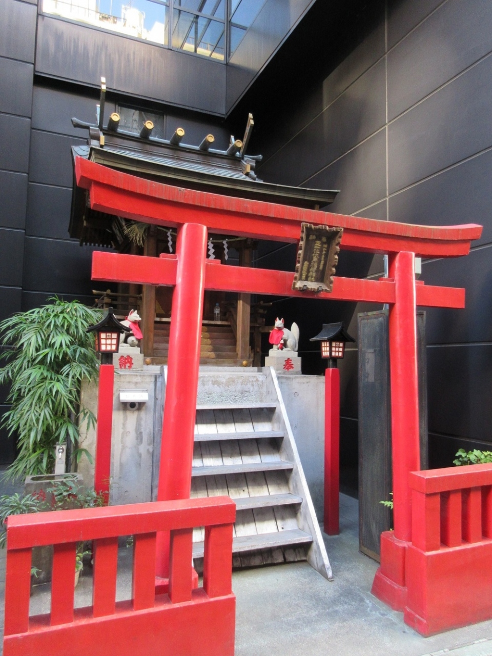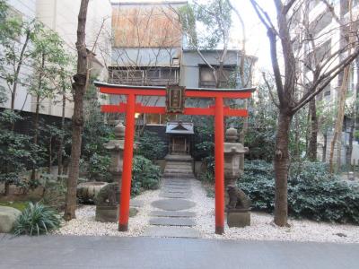 銀座界隈を散策していると、何か所も稲荷神社があり、商業との深い縁を感じざるを得ませんでした。銀座柳通から一本京橋よりにある銀座桜通りに向かおうと細い道を歩いていると、ビルとビルの間の狭小地に、本当に小さな稲荷神社があるのに気が付き近づいて見ました。まだ出来て間もない社殿と鳥居があり、ステンレス製のお賽銭箱が台座のキャビネットに組み込まれていて、他ではあまり見たことの無いユニークな造りでした。