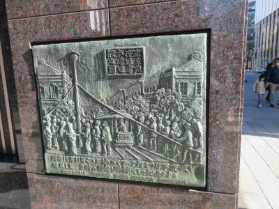 銀座中央通りから、銀座2丁目のマロニエ通りに入る角地に建つビルの外壁に、【電気灯柱記念碑】があり目に留まりました。「明治15年にアーク灯を立てて不夜城を現出した」との文字と、驚きを隠せない人たちの様子を表現した青銅製のレリーフで、日本の最先端を走っていた銀座の様子が目に浮かぶようでした。