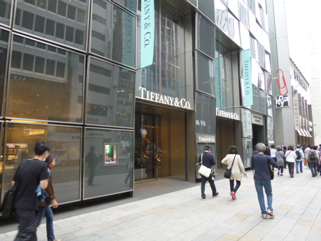 銀座中央通り沿い、文房具の伊藤屋のそばにあるティファニーのお店です。ご存じ宝飾品の専門店で、素敵なデザインの指輪など、ショーケースに並べてあって、若い女性など真剣な眼差しで見入っていました。また、オードリーヘップバーンの往年の某映画を彷彿とさせるディスプレイもあったりと格式を感じさせる空間は流石です。