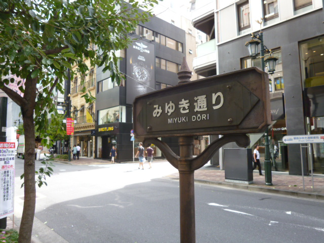 新橋演舞場と日比谷公園の間を結んでいる通りが「みゆき通り」で、明治天皇が行幸された「御行」にちなんでいるそうです。晴海通り程ではないですが、この通りも高級ブランドのお店が集まるエリアで大勢の買い物客で賑わっていました。ちなみに歴史建築として評価の高い泰明小学校はこの通りが東急プラザ銀座の南で湾曲する場所にあります。