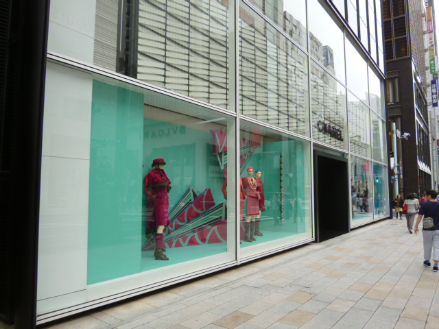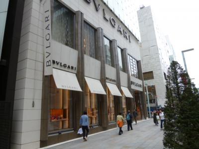 銀座の中央通りにあるブルガリで、ビルの1階から3階までがショップになっています。ショーケースには高級ジュエリーが並び、どれも魅力的な光を放っていました。私にとっては、各航空会社の機内販売で一時期販売されていたデザイン性の高い時計をきっかけに注目するようになったジュエリーブランドです。今でも宝飾時計として飽きの来ない洗練されたデザインですし、ついつい見入ってしまいました。