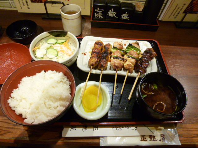 阪急梅田駅からすぐのホワイティ梅田ノースモールにある正起屋さんで税込900円の焼き鳥の定食を頂きました。昼時な大変な賑わいで、カウンター席もテーブル席もすべて一杯。ただ、回転は速いので少し待てば座れますね。