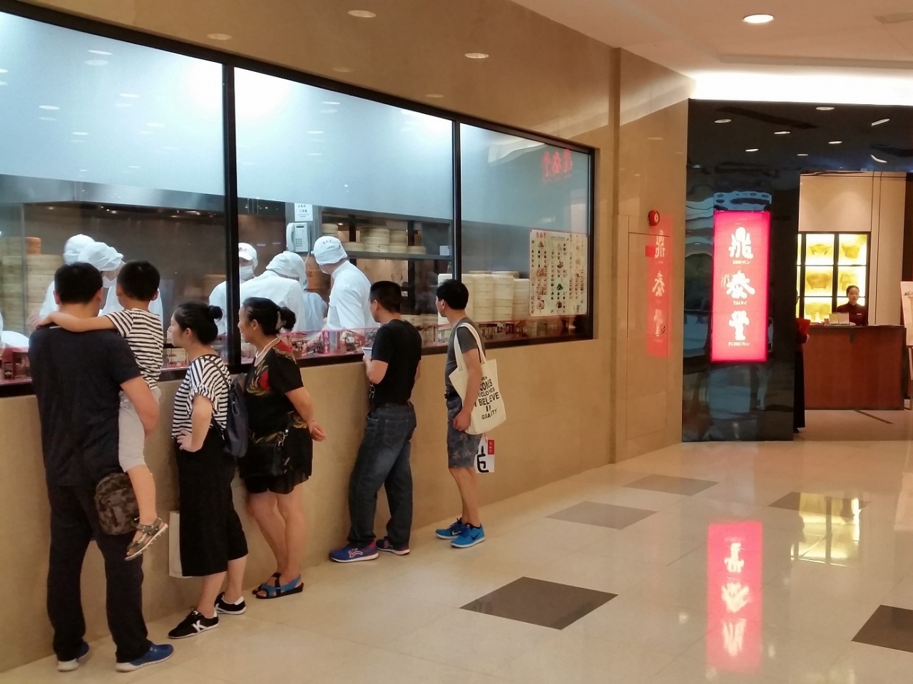 小徐家匯を代表するショッピングモール5Fにある鼎泰豊は、小籠包を作っている様子をガラス越しに見ることが出来ます。写真を撮ろうとしましたが自分の姿が映ってしまうので遠目に一枚。小籠包を作るスピードの速いこと速いこと、まさに職人技です。