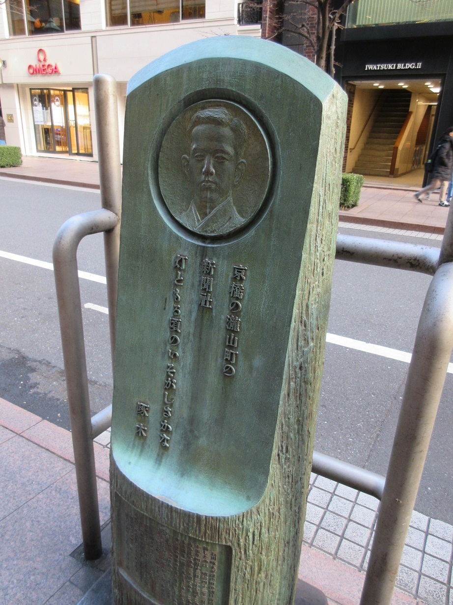 銀座を散策していた際、銀座6丁目の歩道でこちらの【石川啄木歌碑】を見つけました。歌碑には彼の歌の他に肖像のレリーフまであり、それを見るとなかなかの男前であったようです。この地にあったあった朝日新聞社に勤務し、3年ほどを過ごしたことが書かれていました。人通りの多い通りなのですが、意外と足を止める人も少なく、ほとんどの方が通り過ぎていきました。