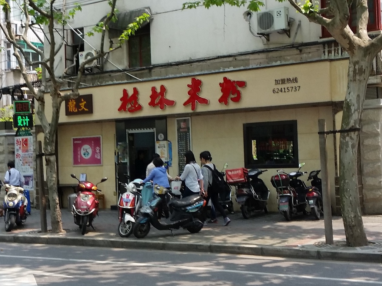 日系企業のオフィスの多い虹橋エリアにあります。この界隈には仕事で何度も足を運んでいるのですが、いつ行っても婁山関路にあるこのお店は昔も今も頑張って商売していますね。「桂林米粉」のお店で、近くのオフィスで働くオフィスワーカーも含め、昼時は大勢のお客さんで賑わいます。米粉には、お好みでピーナッツ(花生)や目玉焼き(荷包蛋)などをトッピングして皆さん食べています。安いのですが腹持ちは良くないようで、すぐにお腹が空いてしまいます。