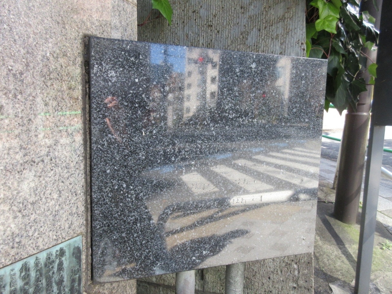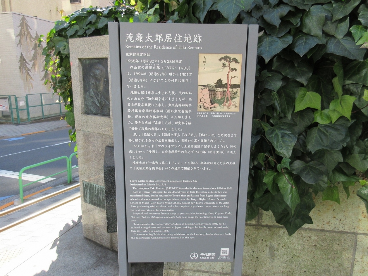 様々なドラマにも登場する、明治の日本を代表する作曲家である滝廉太郎が、多感な青春期に住んだ場所に【滝廉太郎居住地跡の碑】が設置されていました。「花」「荒城の月」が有名で、大分などでもゆかりの地を訪ねたことがあり、こちらの碑を見つけた際は感慨深く感じました。説明文の脇には荒城の月のメロディーが刻まれ、おもわず口ずさんでしまいました。
