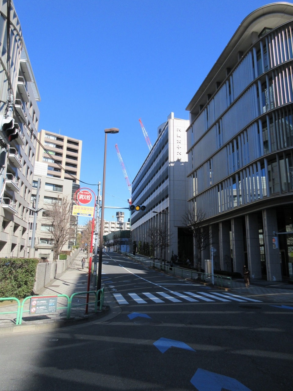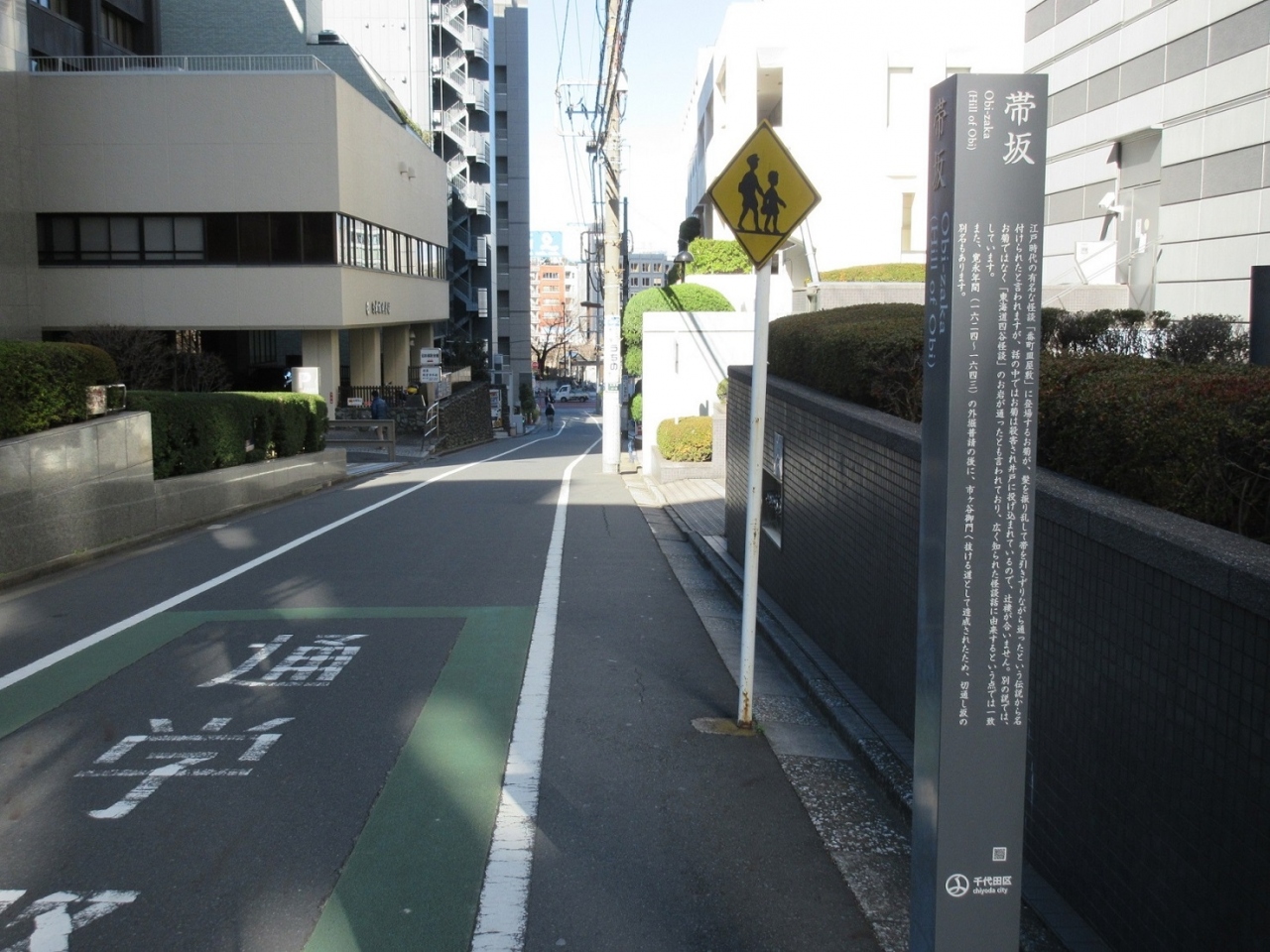 【滝廉太郎の住居跡】の碑を見学後、内堀通りへの延びるこちらの【五味坂】も歩いてみました。片側のみ車道と歩道が分離された道路で、坂の向こうに皇居の緑が見えており、その点は気持ちよく散策できました。ただ、マンションが道路の両側にあり住民のごみ出しをする関係なのか、街の景観としては少し雑然とした感じも受けました。