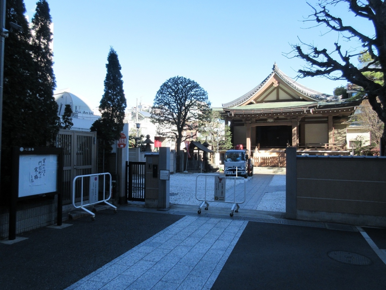 四ツ谷界隈を散策した際、麹町六丁目そばに、【番町文人通り】と【番町中央通り】に挟まれるようにして建つ【心法寺】に立ち寄りました。大通りから少し入った場所なので、人通りも少なかったです。丁度お寺の工事関連の車両が入っており、境内には入らず外観のみ見学しました。住職さんが書いたのでしょうか、和歌が門の脇に掲示版に掲げられており印象的でした。