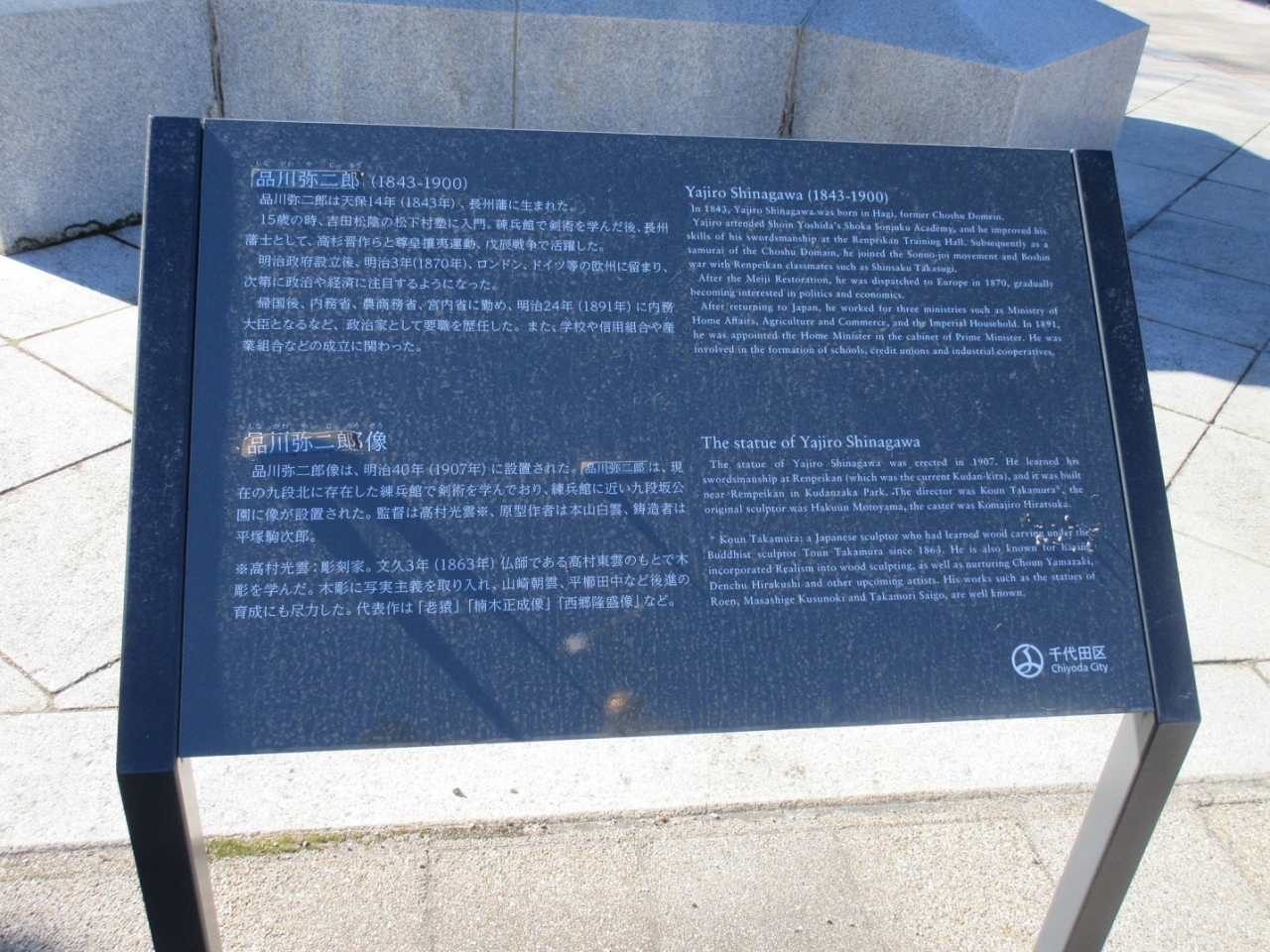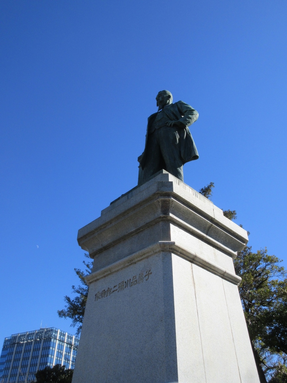 市ヶ谷から九段下界隈を散策した際、【九段坂公園】にある【品川弥二郎像】を見学しました。大山巌ほどは知られていないかもしれませんが、吉田松陰から教えを受けた門下生で、尊皇攘夷運動で活躍した方です。明治政府でも内務大臣を務め、信用組合の設立など、日本の新しい国造りに大きな功績があった方とのこと。大きな像はコート(燕尾服?)姿のひげを蓄えた姿をしており、近くの大山巌の騎馬像との対比も興味深く感じられました。