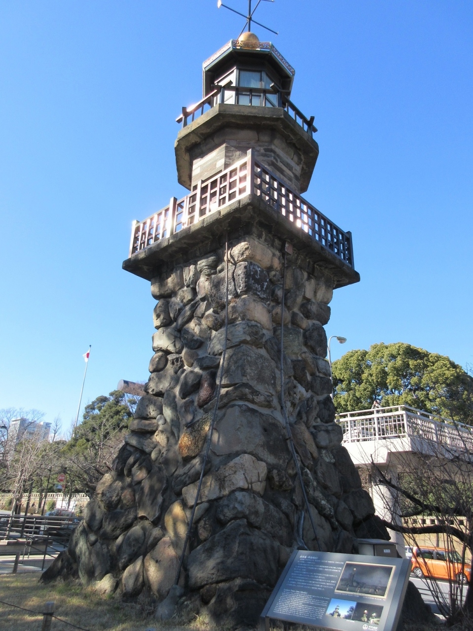 市ヶ谷から九段下にかけて散策した際、【九段坂公園】の中にある 【高燈篭】を見学しました。明治4年に靖国神社の常夜灯として建てられたもので、高さが16メートル以上ある立派な物でした。大きなビルも無い時代ですから、遠く離れた東京湾からも見えて灯台の役割も果たしていたようです。石を積んでコンクリートで固めたような頑丈な造りで、昔からの石灯篭を思わせる形状も見ごたえ十分でした。