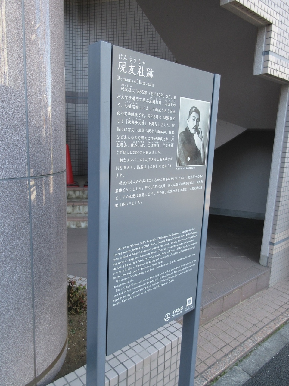 九段界隈を散策した際、冬青木坂という変わった名前の坂道を上がった所にある学校脇に、写真付きの畳半畳ほどの大きさの案内看板が設置されていました。説明書きによると、明治の頃に【硯友社】という文学者のグループがあるまる結社があったとのこと、番町にある文人通りからも近い場所ですし、皇居から見て北側にあたるこの辺りに、大勢の文化人が闊歩している風景を想像し、興味深く感じました。