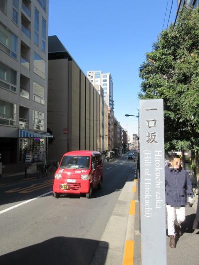 市ヶ谷駅から靖国神社に向かう途中、左手に折れる坂道がありました。緩やかなその坂の端に四角柱の案内標識があり、それによると【一口坂】という名前がついていました。坂の下ると右手に伏見坂、正面には江戸城の外濠を望むことができました。何の変哲も無い通りですが、法政大学が近くにあるからなのか、人通りは意外と多かったです。