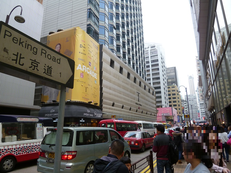 尖沙咀の二本の南北に走るメインロード「弥敦道ネイザンロード」と「広東道カントンロード」をつなぐのが北京道です。ハーバーシティーから国際広場(I Square )の辺りが、最も賑やかで繁華な場所ですので、嫌でもこの北京道を通ることになると思いますが、歩道は意外と狭いのですれ違いの際にはご注意を。