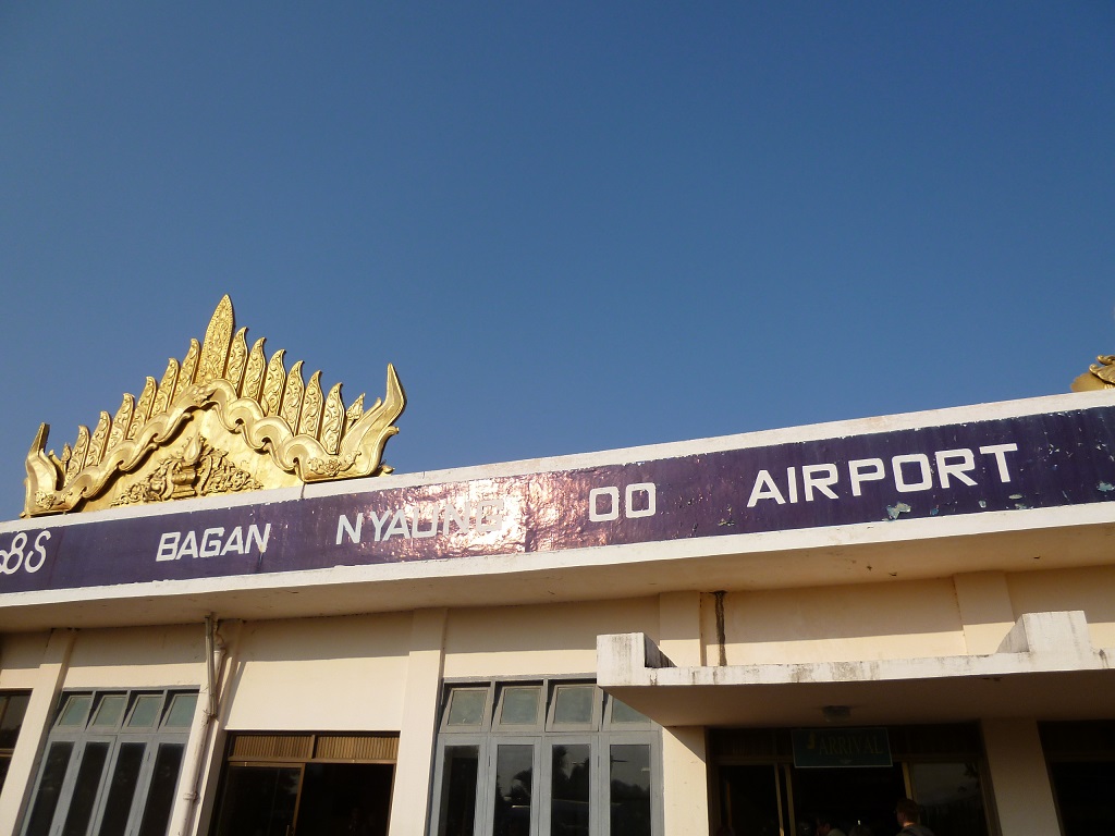 パガン観光の空の玄関口がこのニャウンウー村にある空港です。空港というより飛行場といった方がふさわしい位にコンパクトで施設も最低限のレベルです。その分、迷うこともないでしょうし、街(村)から近く30分ほどで到着しますから、遺跡観光がメインと割り切れば苦にならないでしょう。