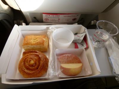 正規運賃のようで日本円で往復3万円以上でした。機体は中古のようで窓もこすれた傷だらけで窓外の風景を楽しむという感じはありませんでしたが、それ以外には時間にも正確でしたし、1時間ほどのフライトでもパンとジュースという軽食が出ました。国内線ですし及第点だと思います。