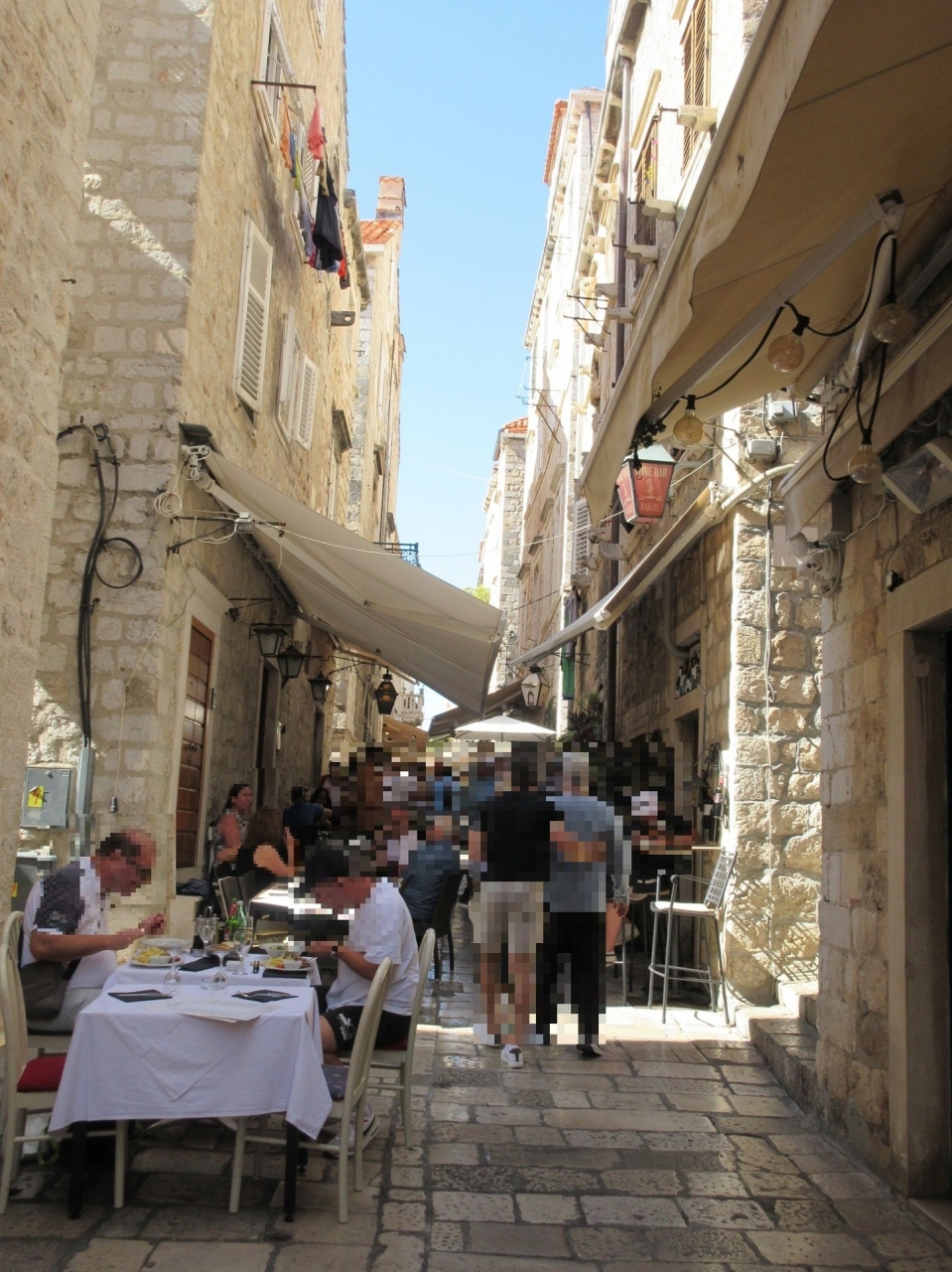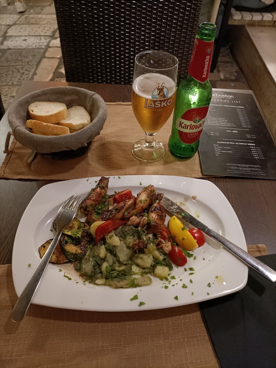 ドブロブニクの目抜き通りである【プラツァ通り】から見ると、山側に向かって東西に平行に走るかたちになっている【プリェコ通り】を夜訪れると、何軒もの飲食店がテーブルを出しており、観光客で大変に賑わっていました。どこで食事をしようかと迷いながら歩いていると、東端の【聖二コラ教会】の手前にあるしゃれた雰囲気のこちらのレストランが目に留まりました。お値段はドブロブニクにしては手ごろなのか、隣には若者のグループが利用していました。丁度2人用のテーブルが空いており、待つこともなくテーブルに着くことが出来ました。私は先述の黒く煤けて雰囲気のある【聖二コラ教会】を見ながら、シーフード中心のお料理を楽しみました。ドリンクも頼んでお値段は30ユーロ程でした。