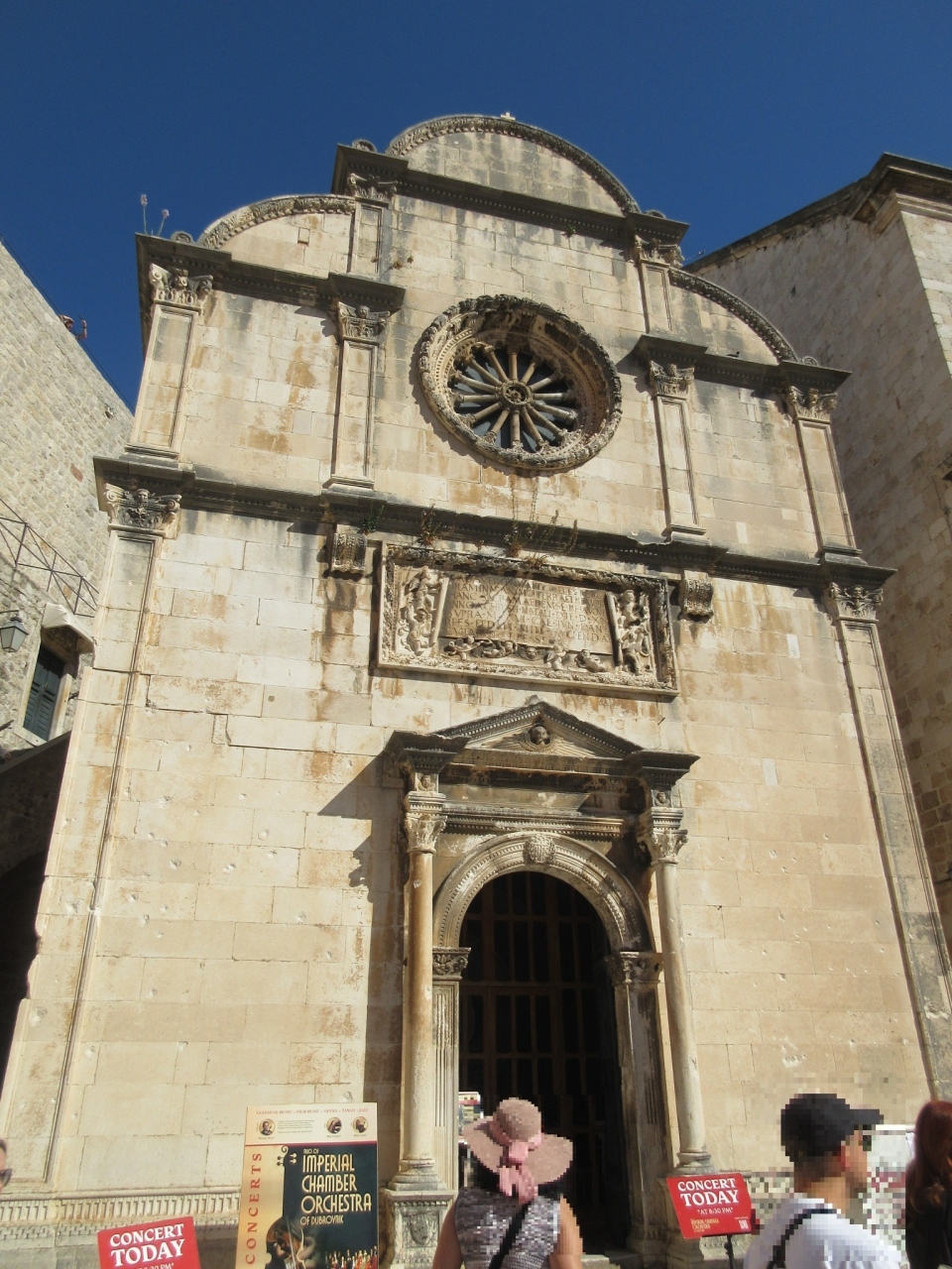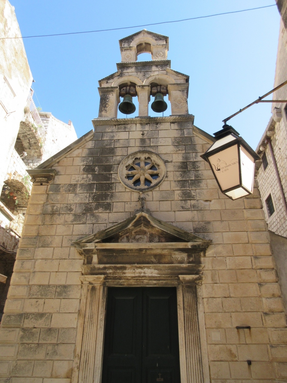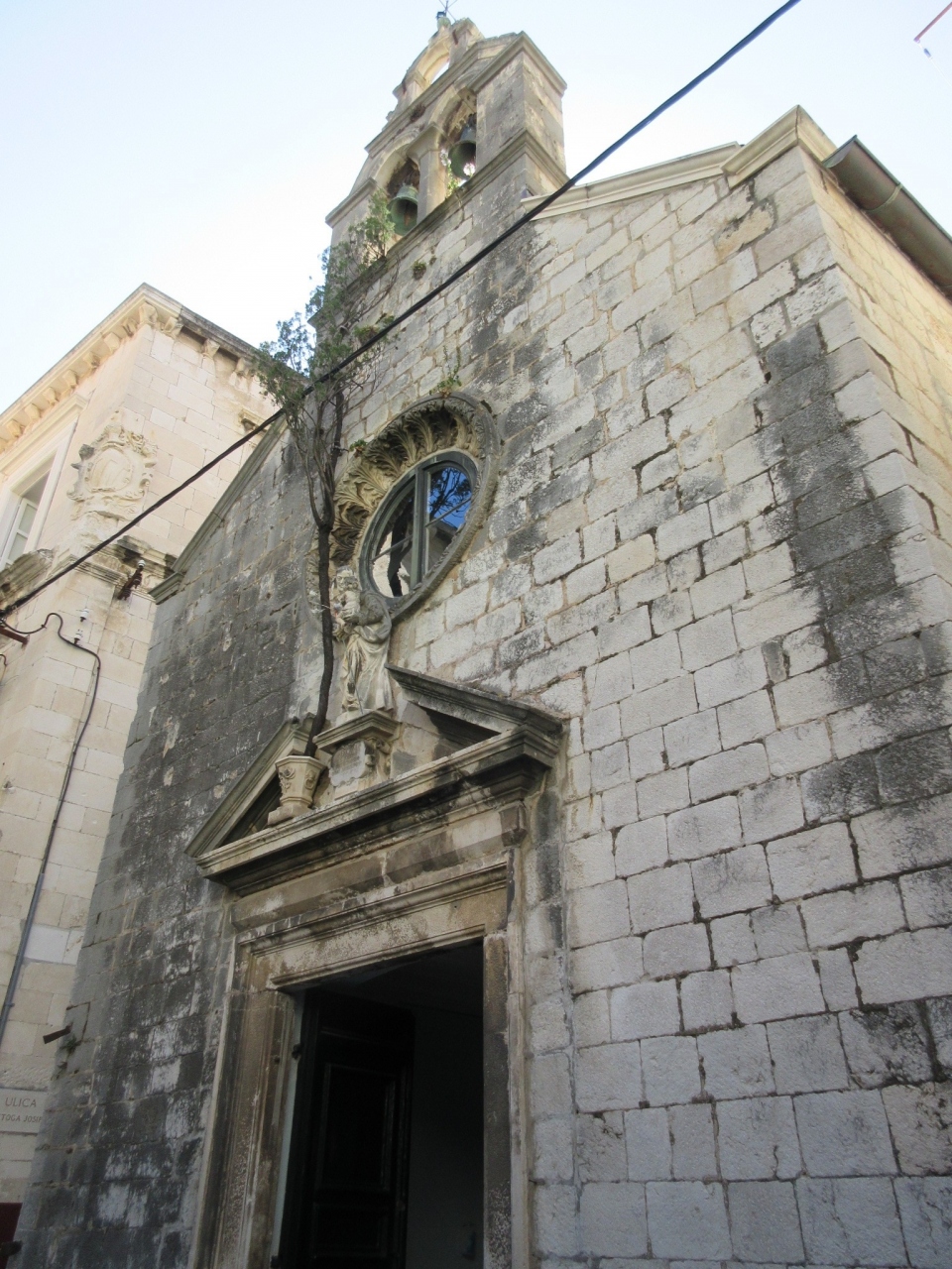 【ドブロブニク旧市街】を【マリン・ドルジッジの家】【セルビア教会】などを見学しながらそぞろ歩いた際、細い路地で見つけた小さな石造りの教会がこちらの【セントジョセフ教会】です。エントランスの上部には腰が少し曲がった聖像の像が置かれていました。その左には、聖人の使う杖のようにも見える細い木が生えていて、その根を取り除いてしまうと教会正面の壁面が崩れ落ちてしまうかのような、そうした古さというか儚さが感じられる佇まいでした。