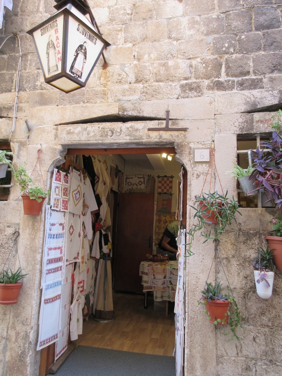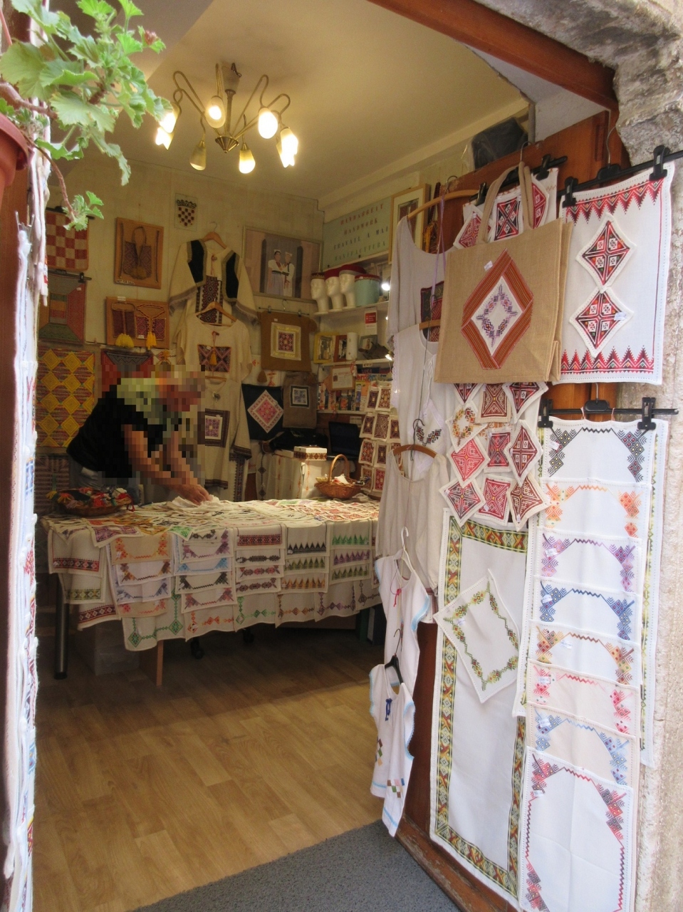 【ドブロブニク旧市街】の目抜き通りである【プラッツァ通り】から北側にある【ブジャ門】に向かって路地を上がると、東西に走る細い【プリェコ通り】に交差しました。この細い通り沿いを散策していると、古い石造りの建物を利用したおみやげ物があり、それが刺繡製品が有名とフォートラベルで紹介されていた【バチャン】でした。店内には、白地に赤の刺繍が施されたテーブルクロスや洋服などが壁も利用して陳列してありました。2人も入ると溢れてしまう程に小さな店内ですが、クロアチアらしいお土産を購入できるお店でした。
