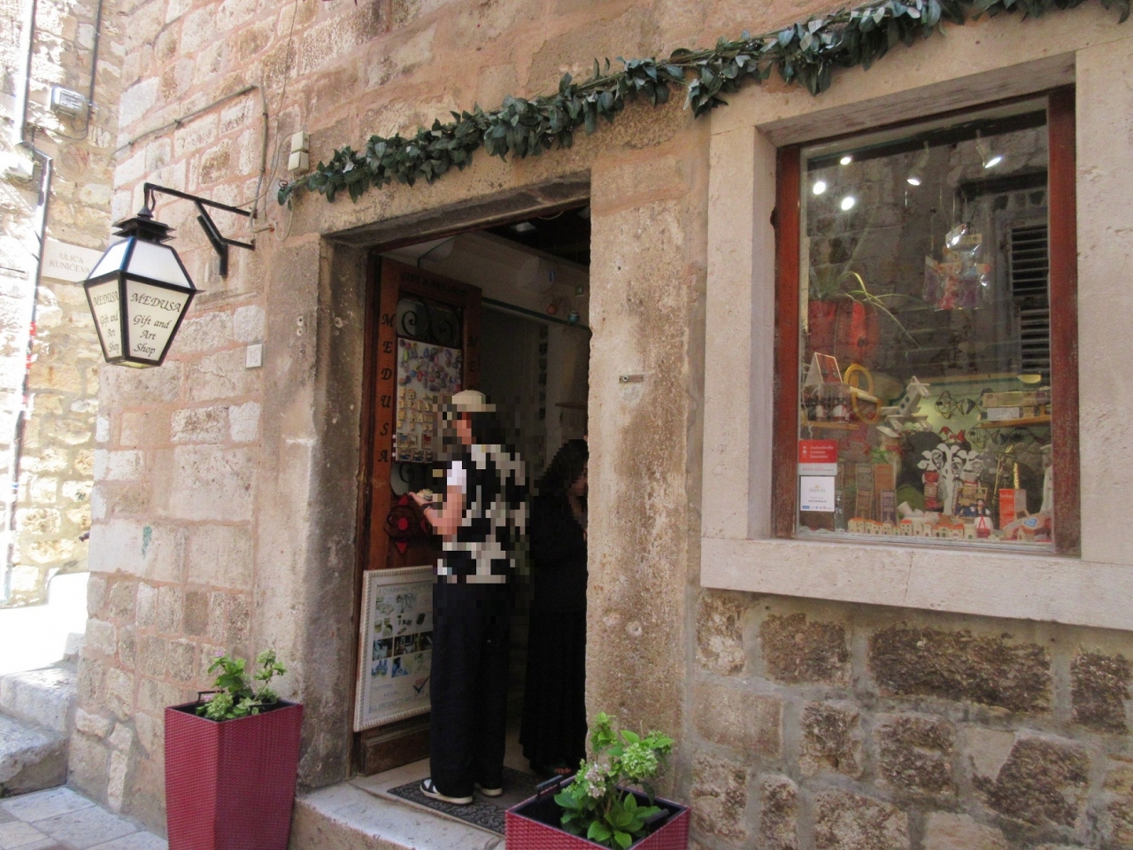 【ドブロブニク旧市街】の目抜き通りである【プラッツァ通り】から山側に路地を上がると、東西に走る細い【プリェコ通り】に交差します。この細い通り沿いを散策していると、“Gift & Art Shop”と書かれたランタンが掲げられた小さなお土産物やさんがあり、立ち寄りました。私以外にも狭い店内には女性の観光客が2人利用しており、女性受けする可愛らしいデザインのお土産物が多いように感じられました。壁付けマグネットは嵩張ることもなく、かつお値段も手ごろでお勧めです。