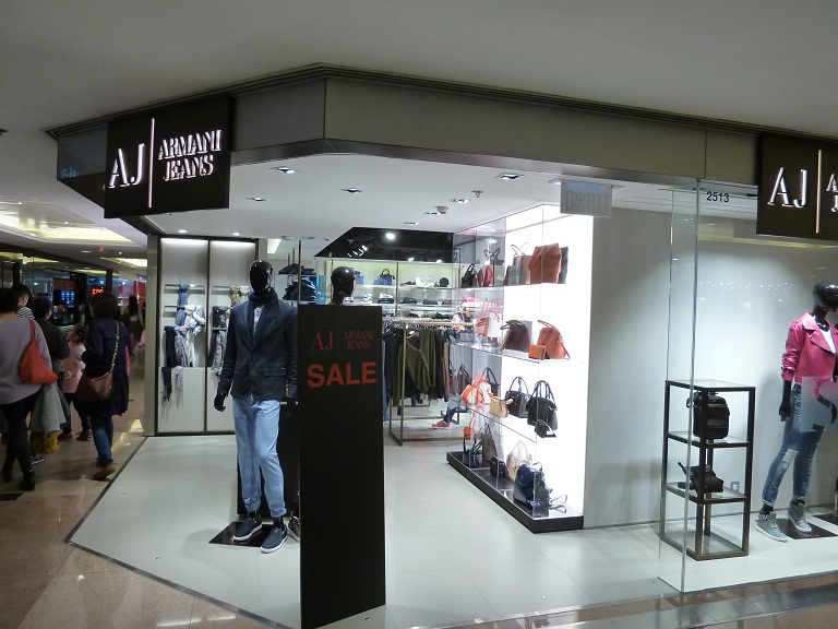 Armani JeansはArmaniでもカジュアルテイストの強いアイテムで、Harbour CityのGateway Arcadeの2階(日本の階数の数え方では3階)にあり、スターフェリーの埠頭からエスカレーターを上がってそのまま直進するとアクセスできます。近くにはCalvin Klein Jeansなどもありいつも大勢の人で賑わっています。