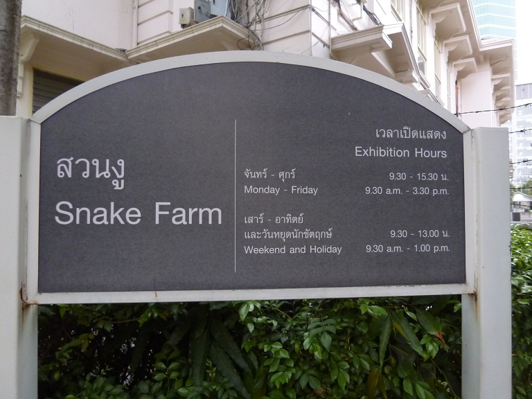 地下鉄サムヤーン駅をおりラーマ4世通りの北側にでます。チャムチュリー・スクエアという商業施設の横のオフィスビルをすぎ緑豊かな公園の中にスネークファームがあります。こちら週末の開館時間が午前中のみとなっているのでご注意ください。私は土曜日の午後に行き、そのままUターンする羽目になりました。