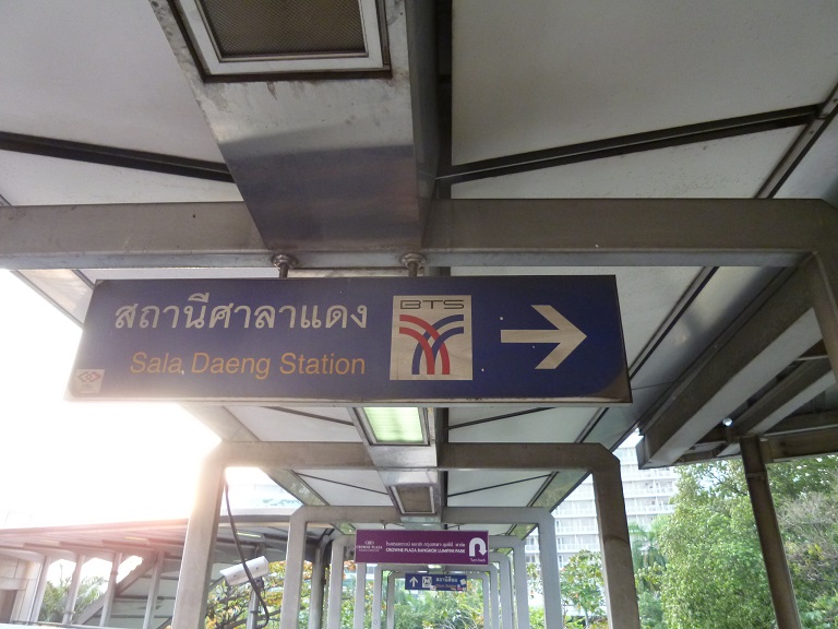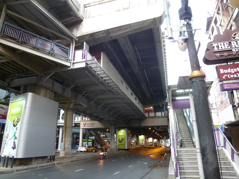地下鉄シーロム駅から高架鉄道であるBTSサラデーン駅への乗り換えは少し面倒です。エスカレータで直接つながっている訳ではなく、地下からいったん地上に出てデュシタニホテルに近い側のコンクリート橋脚のところにあるエレベーターを使ってBTSサラデーン駅に至ることになります。もしくは地上に出てシーロム通りを歩いてサラデーンに向かうという方法ですね。