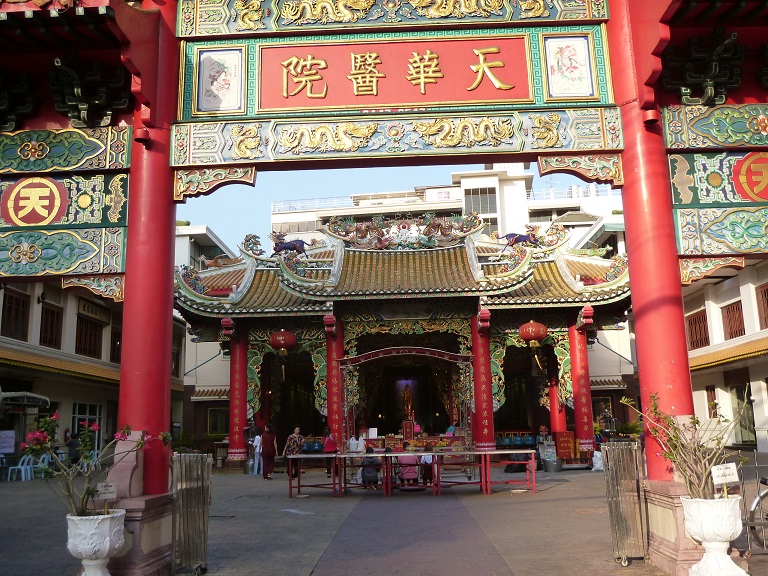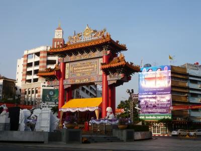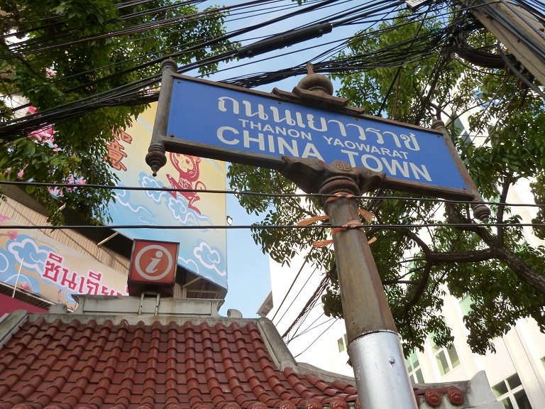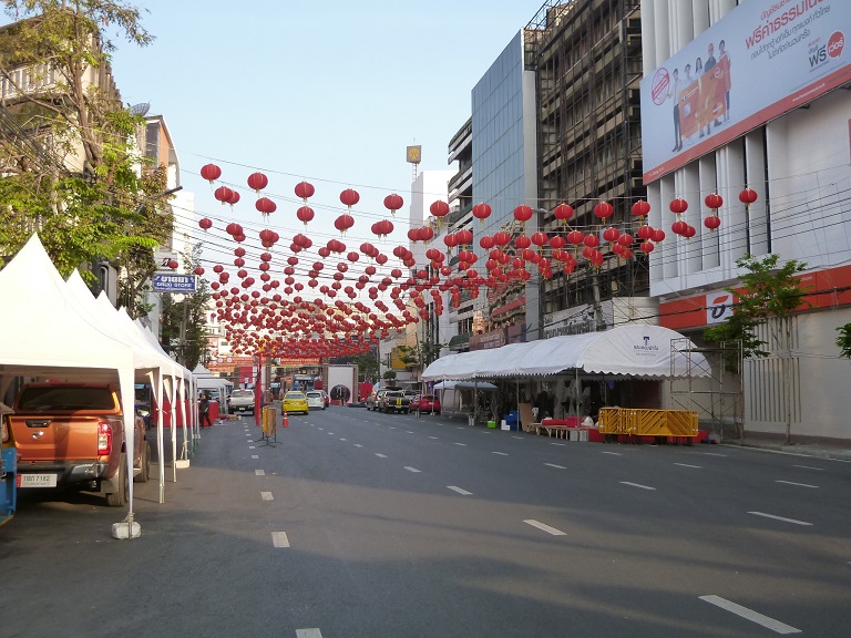 バンコクの鉄道駅「フアランポーン駅」から西に広がるのがチャイナタウンです。このあたりはマレーシアのチャイナタウンほど瀟洒な建物が並ぶわけではないですが、やはり中国語の看板があふれています。丁度春節ということで、赤いランタンなど飾りつけがされていました。