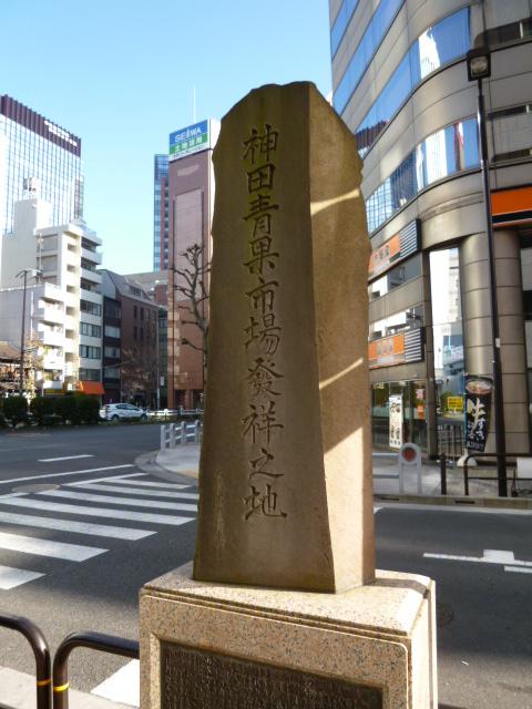 宿泊していたホテルのすぐそばにありました。地下鉄小川町駅から靖国通り側へ出たところにあり、小さな控えめな石碑が立っています。この場所には江戸時代から昭和の初めまで青果市場があったそうです。今はそうした面影は何もなく、この石碑が静かに当時を語るのみです。